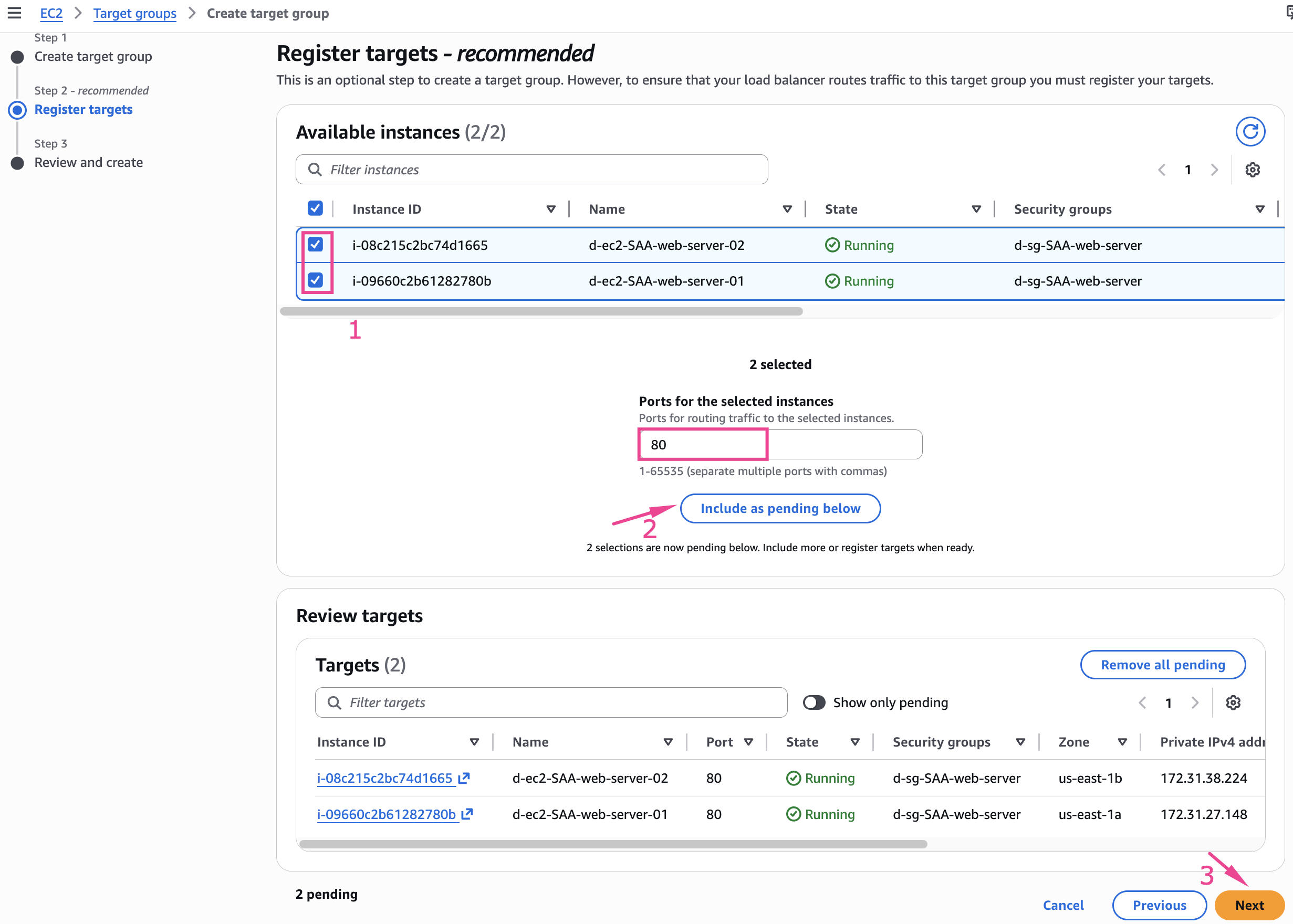 - Tại đây chúng ta sẽ add 2 Instance đã tạo lúc nãy vào Tagets, Check chọn 2 Instance và Nhấn nút Include as pending below