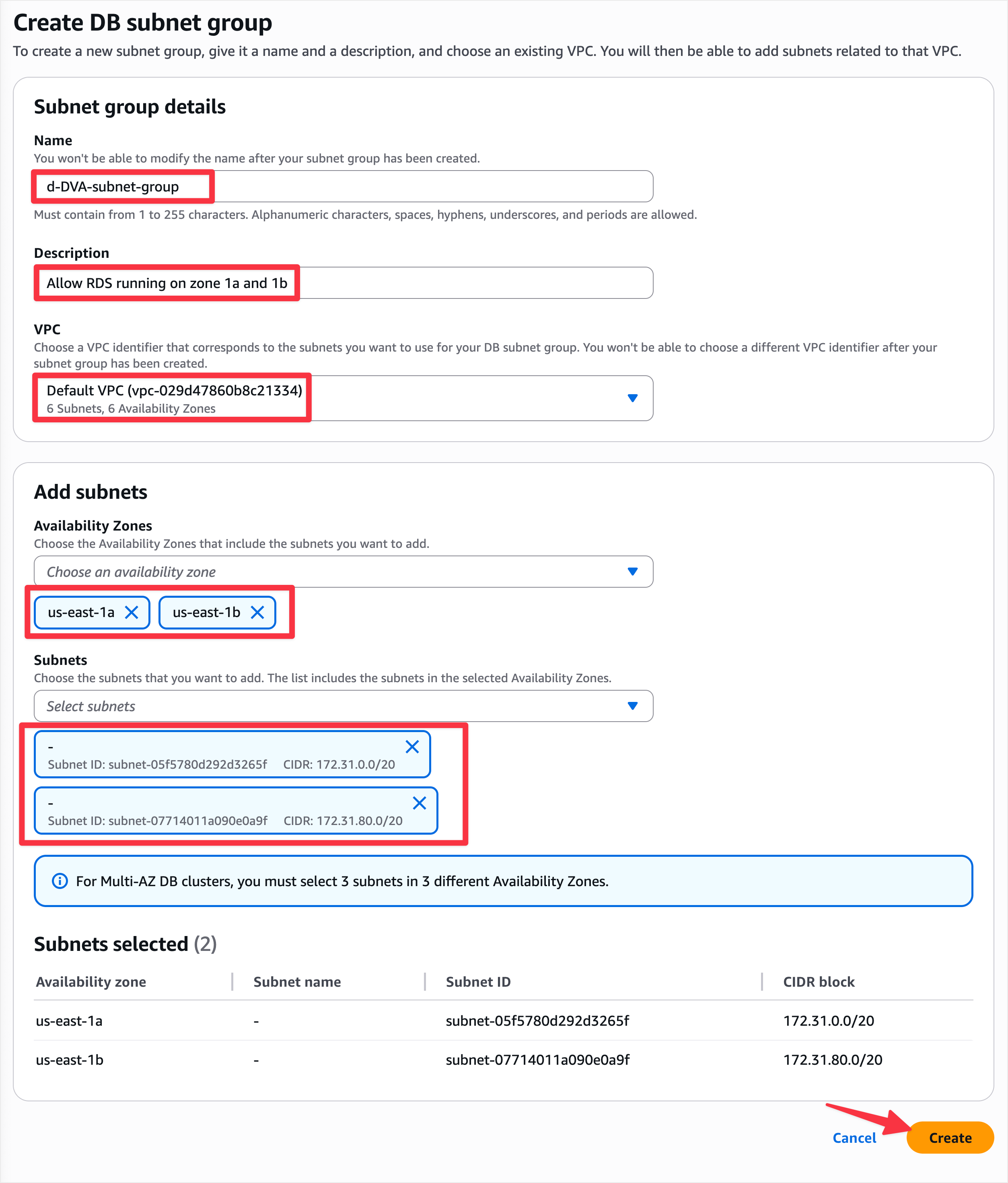 Bài lab này sử dụng VPC mặc định có 6 public subnet trên 6 zone, chúng ta chỉ định 2 subnet trên zone 1a và 1b, RDS sẽ chạy ở 1 trong 2 zone này.