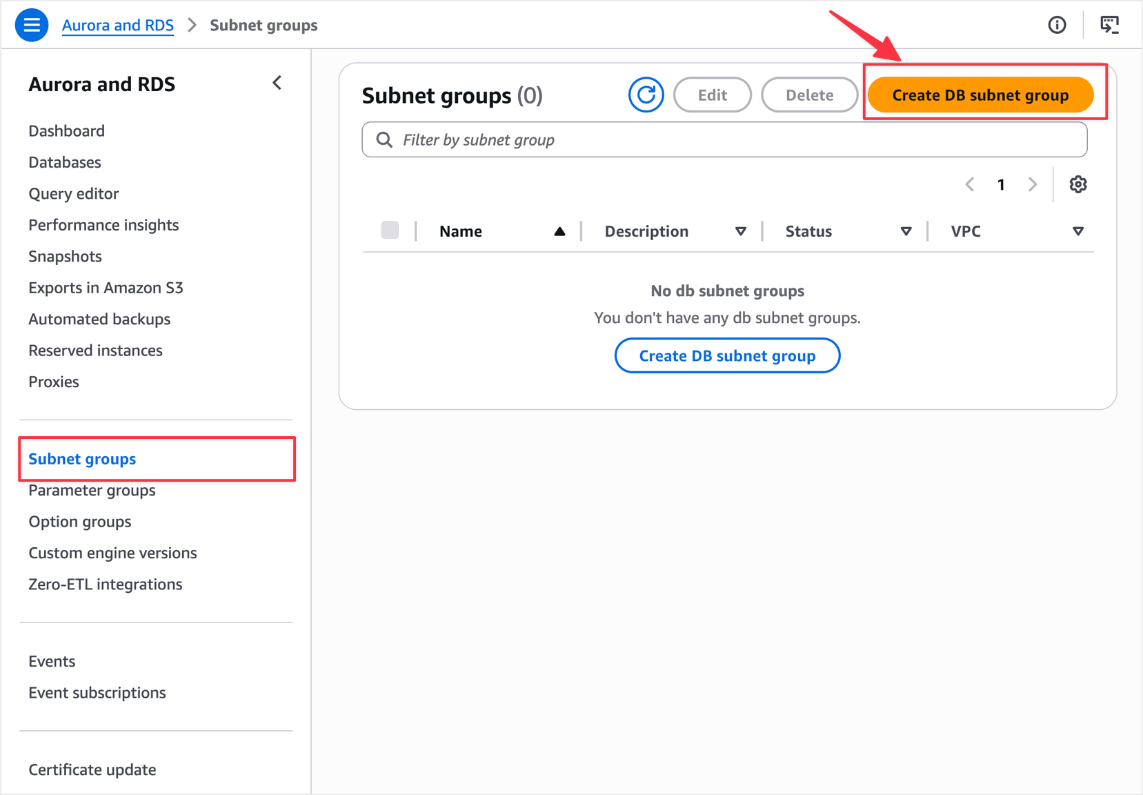 Vào service Aurora and RDS > Subnet groups > Create DB subnet group