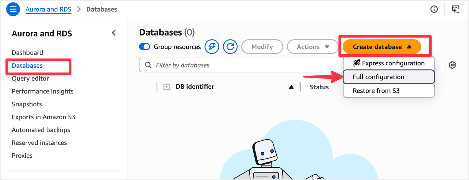 Vào Aurora and RDS console > Databases > Create database> Full configuration