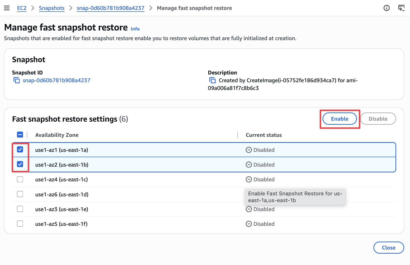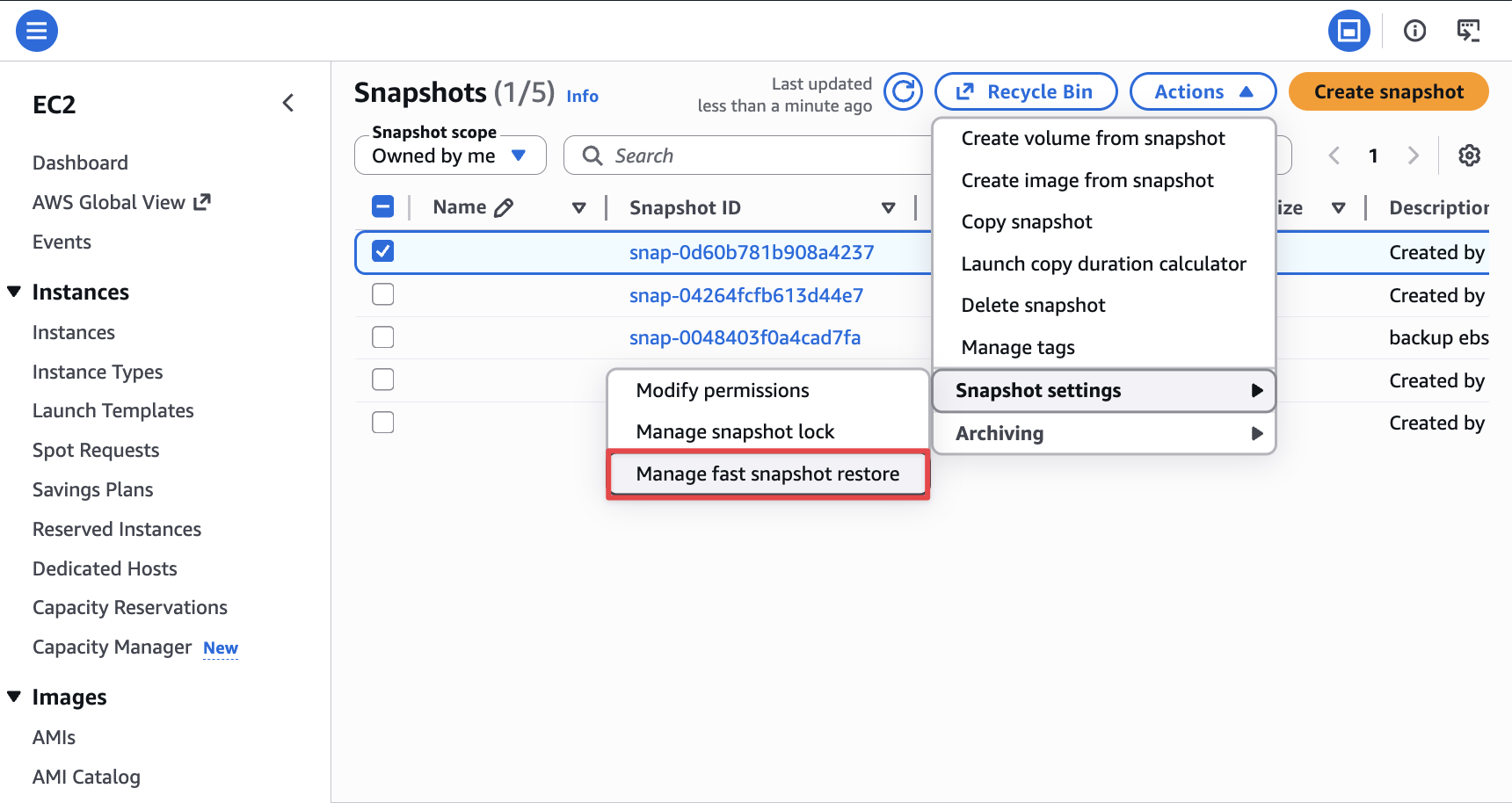 Select snapshot và choose Actions → Snapshot Setting → Manage fast snapshot restore