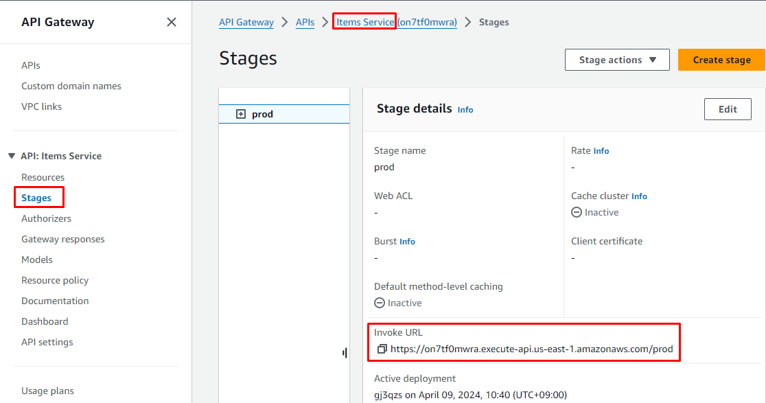 Lấy thông tin API URL ở giao diện API gateway như trên hình