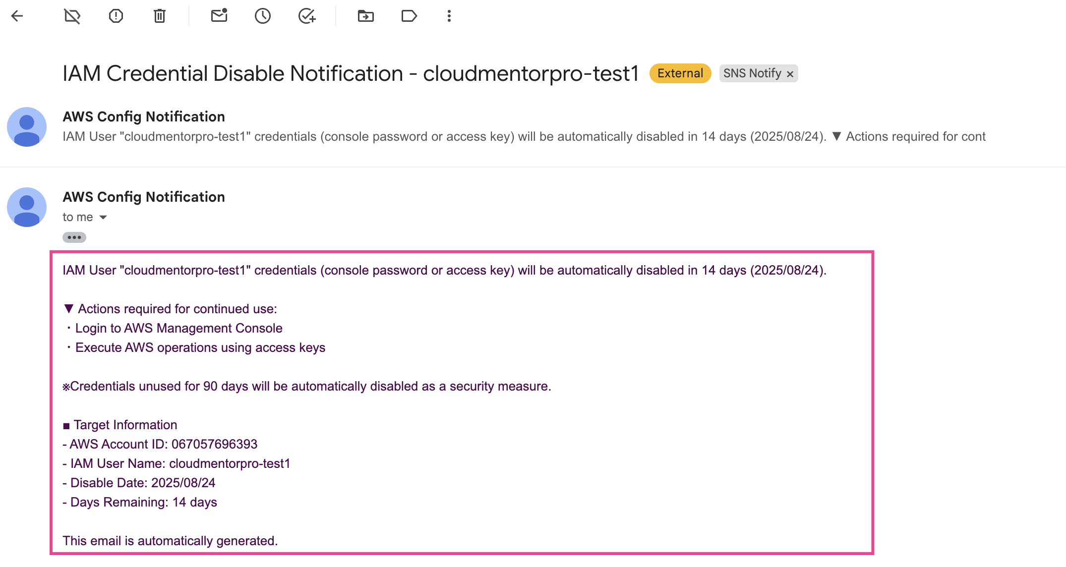 "Message": "{% 'IAM User \"' & $userName & '\" credentials (console password or access key) will be automatically disabled in ' & $string($remainingDays) & ' days (' & $disableDeadline & ').\n\n▼ Actions required for continued use:\n・Login to AWS Management Console\n・Execute AWS operations using access keys\n\n※Credentials unused for ' & $string($maxUnusedDays) & ' days will be automatically disabled as a security measure.\n\n■ Target Information\n- AWS Account ID: ' & $awsAccountId & '\n- IAM User Name: ' & $userName & '\n- Disable Date: ' & $disableDeadline & '\n- Days Remaining: ' & $string($remainingDays) & ' days\n\nThis email is automatically generated.' %}"