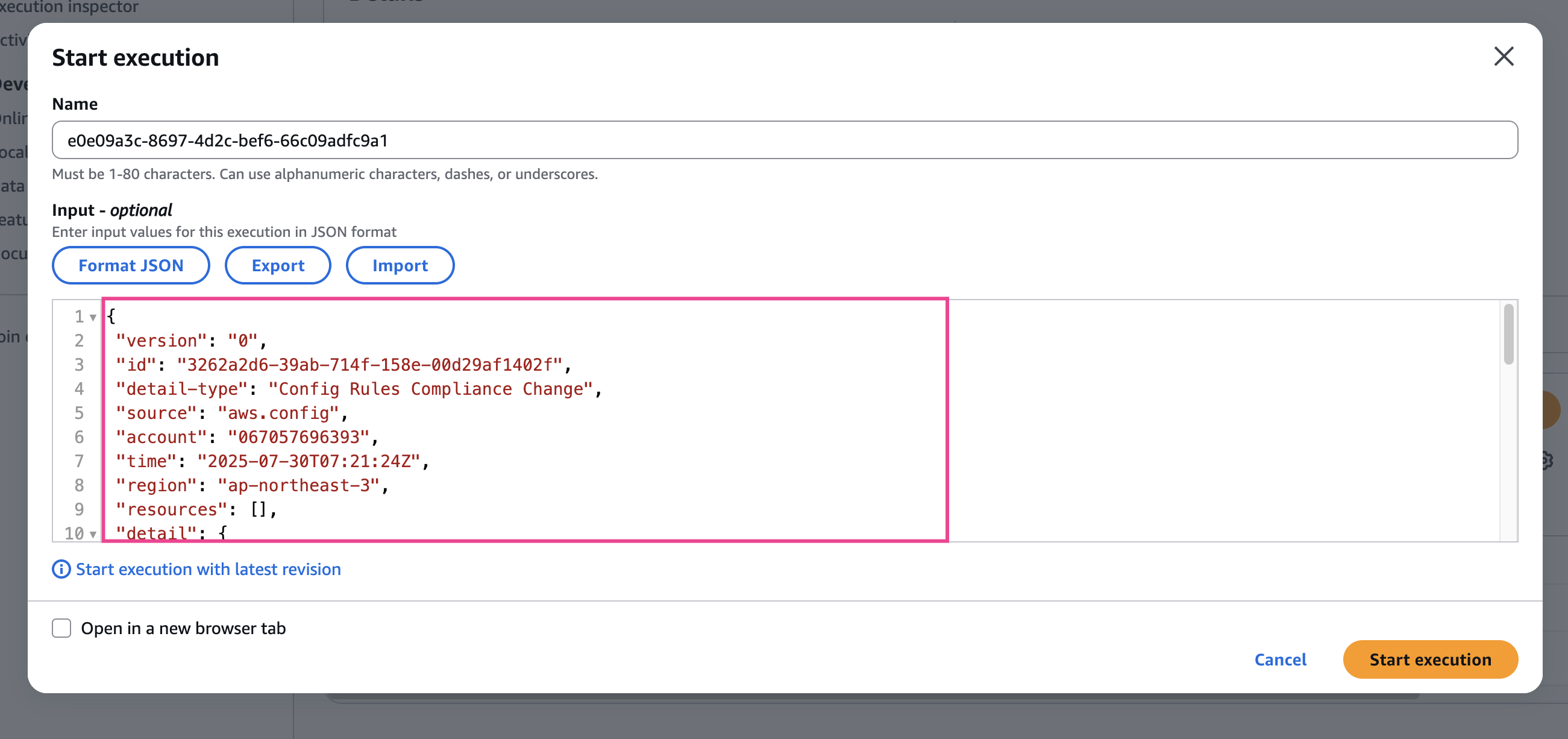 Để chạy với parameter truyền vào đúng như giả lập EventBridge bắt sự kiên Non-compliant xảy ra bạn cần truyền Input khi chạy State Machine như sau: