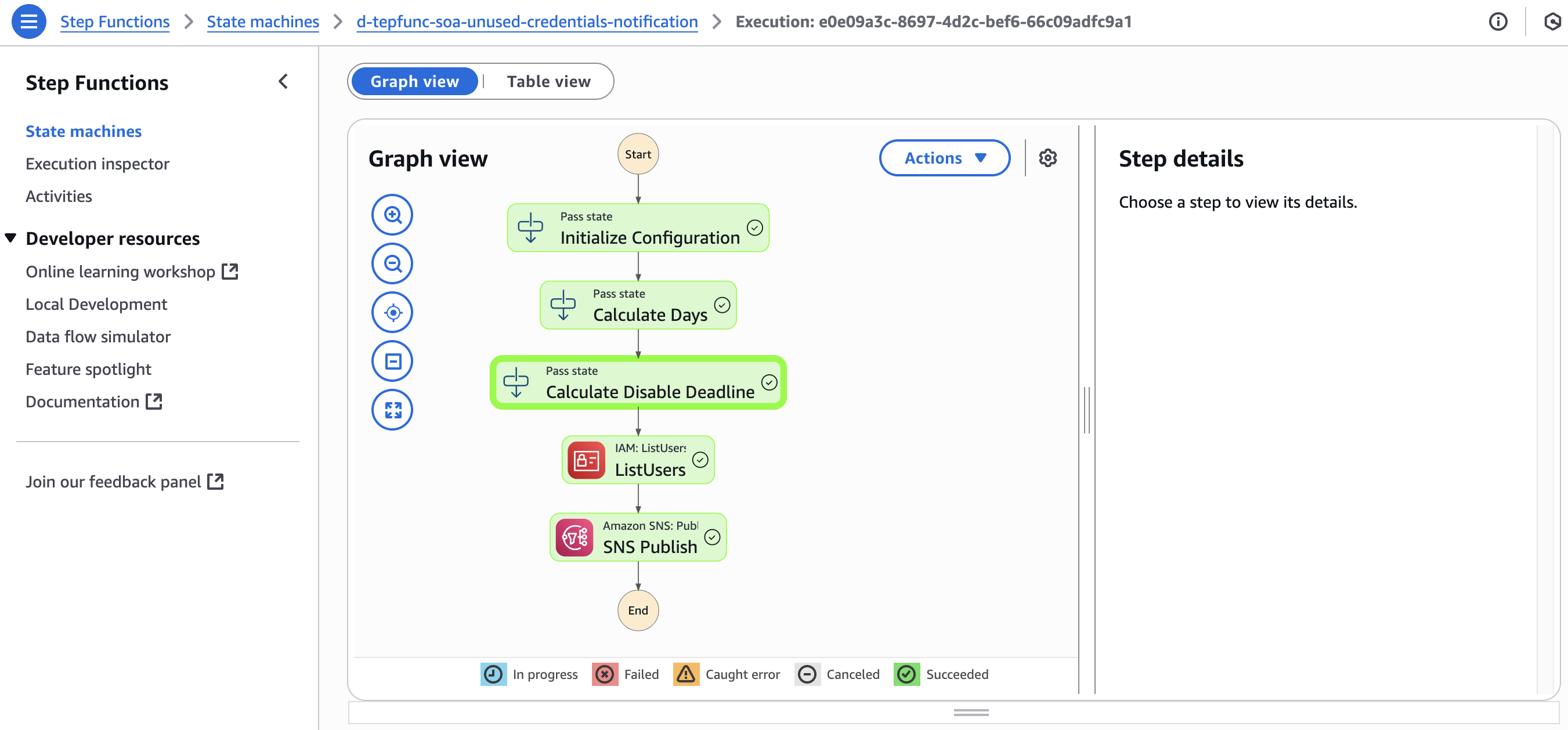 Để chờ đến khi State machine tự động thực thi chúng ta sẽ cần 76 và 83 ngày nữa. Để kiểm chứng xem nó work đúng mong đợi không chúng ta sẽ chạy thủ công.