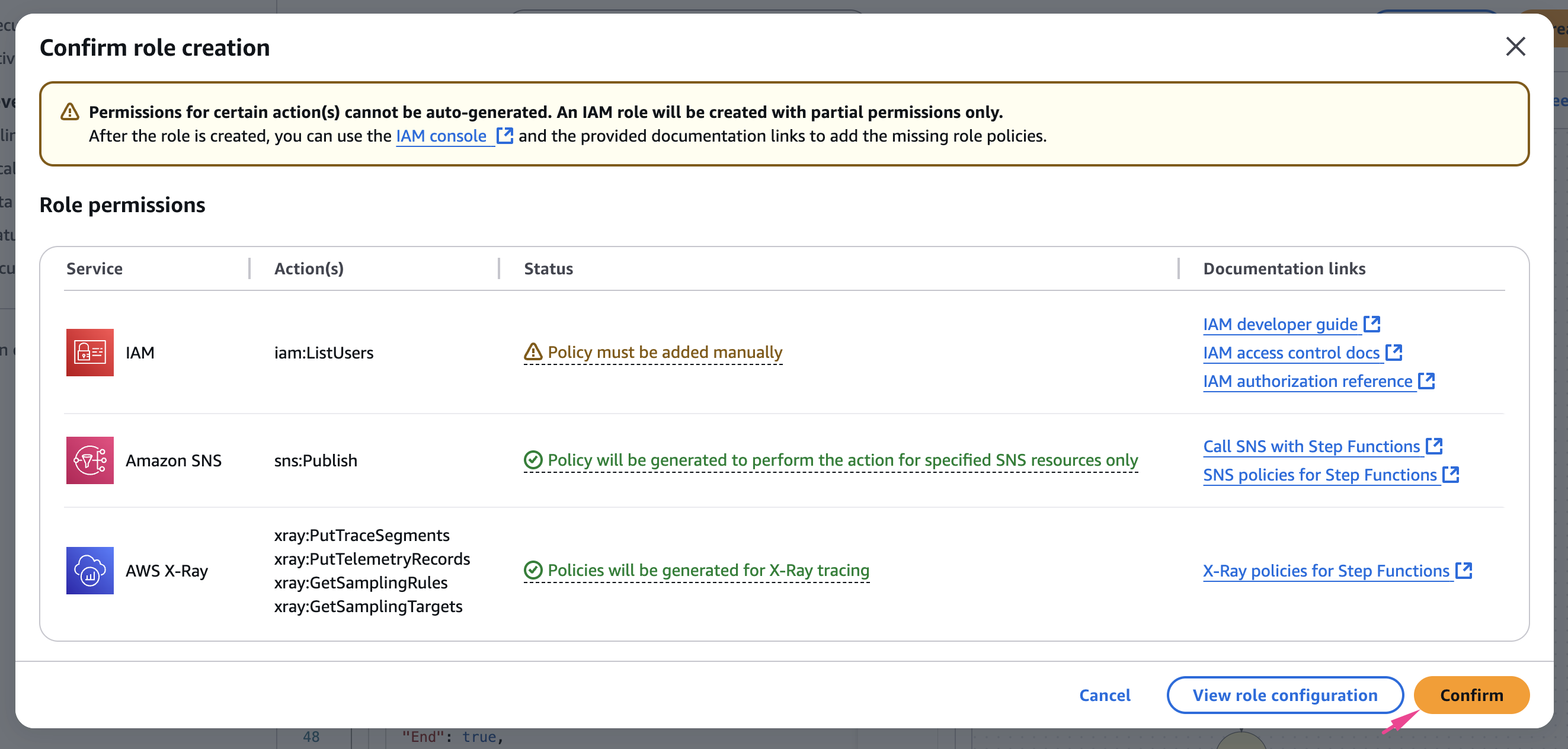 Khi tạo State Machine, IAM role và một phần IAM policy cũng sẽ được tạo tự động. Tuy nhiên Action List User vẫn còn chưa có quyền nên chúng ta sẽ thực hiện tạo thêm policy này.