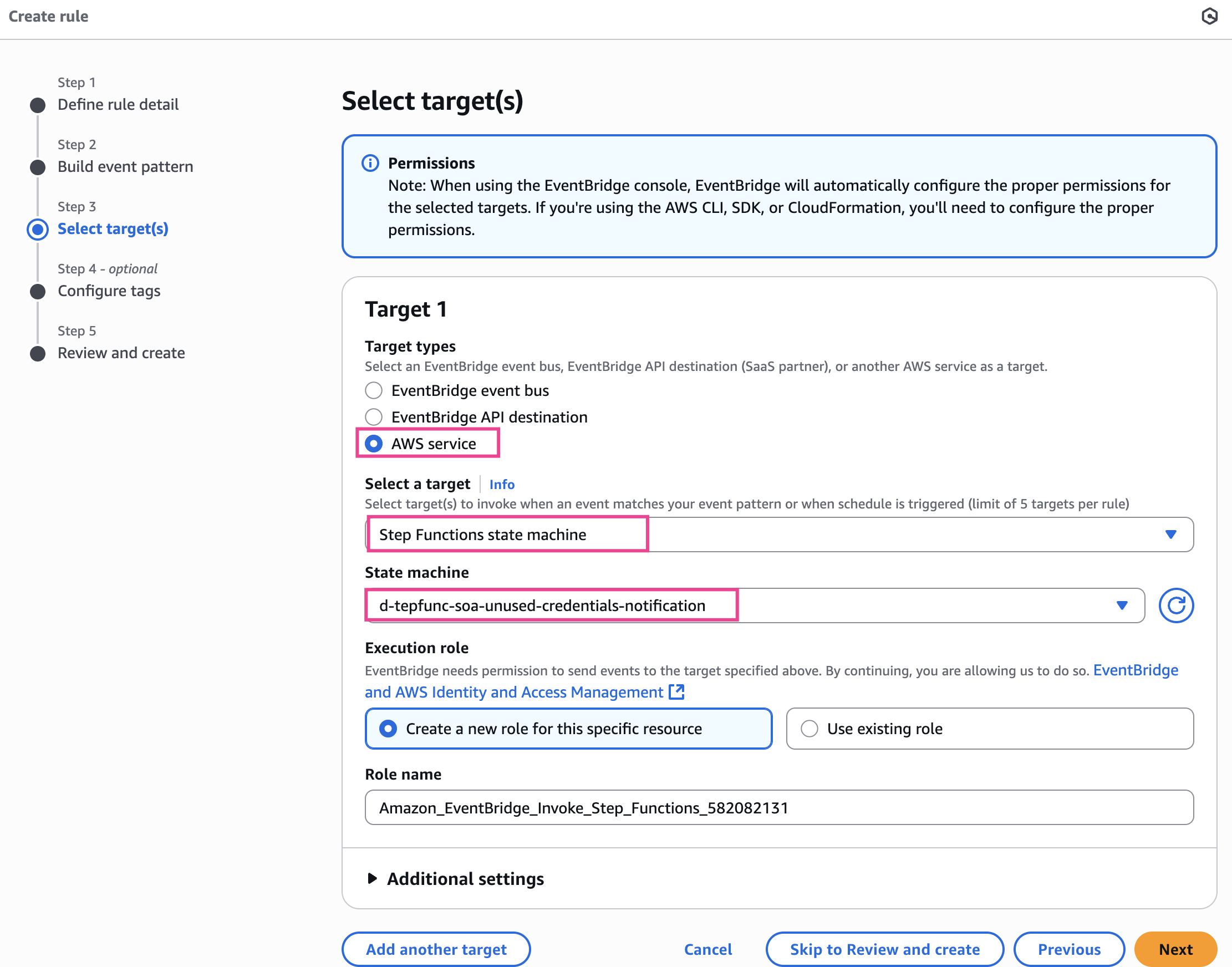 Target của EventBridge rule sẽ được set vào state machine đã tạo trước đó.