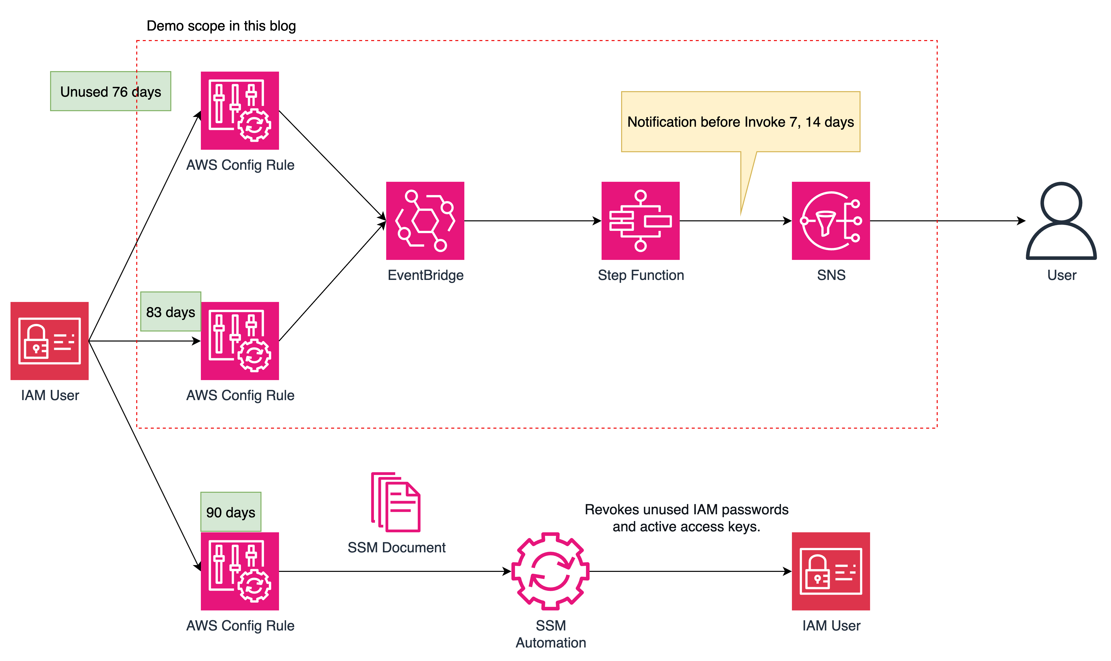 Bằng cách sử dụng AWS Config Rule (iam-user-unused-credentials-check) và AWS Systems Manager Automation, có thể tự động vô hiệu hóa thông tin xác thực của IAM user mà các thông tin xác thực (access key, console password) không được sử dụng trong một khoảng thời gian nhất định.