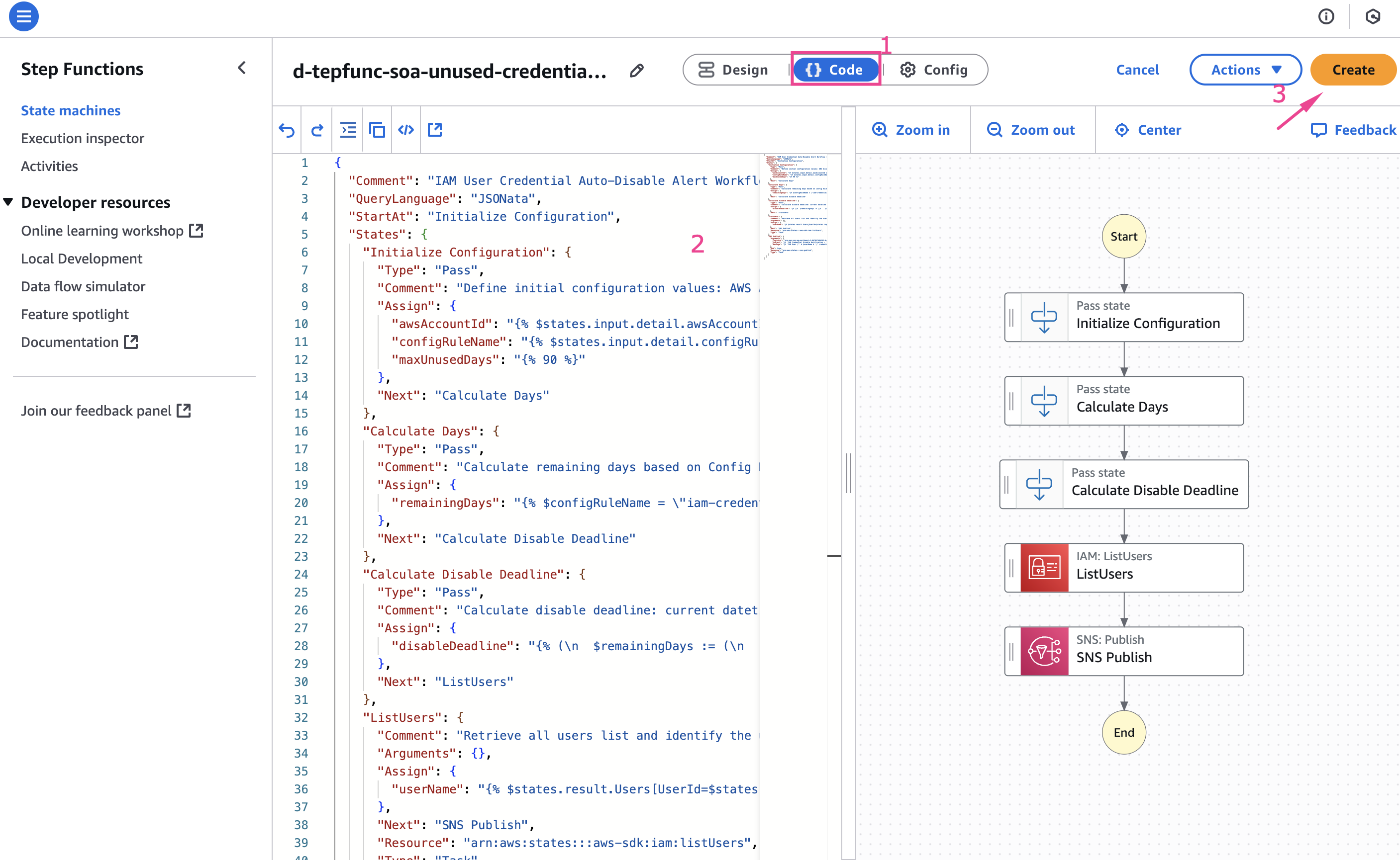 "Comment": "IAM User Credential Auto-Disable Alert Workflow - Send SNS notifications to target users based on Config Rule evaluation results",