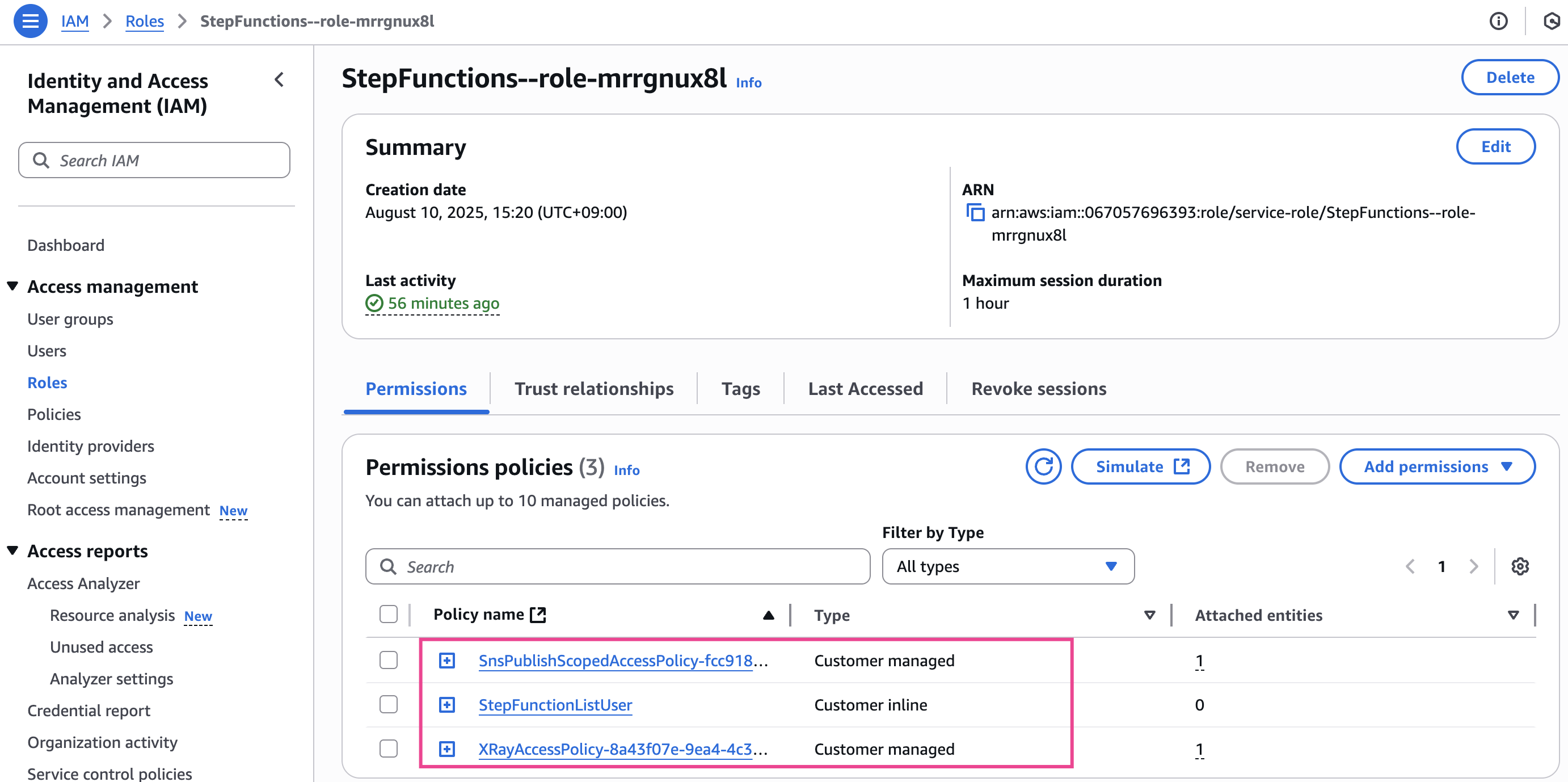 Khi tạo State Machine, IAM role và một phần IAM policy cũng sẽ được tạo tự động.