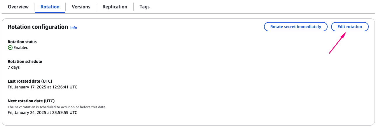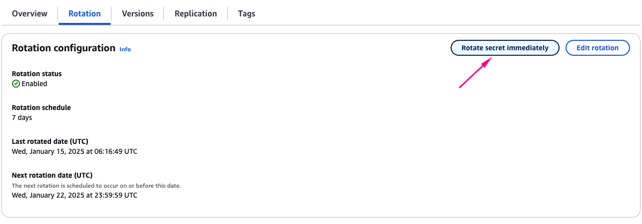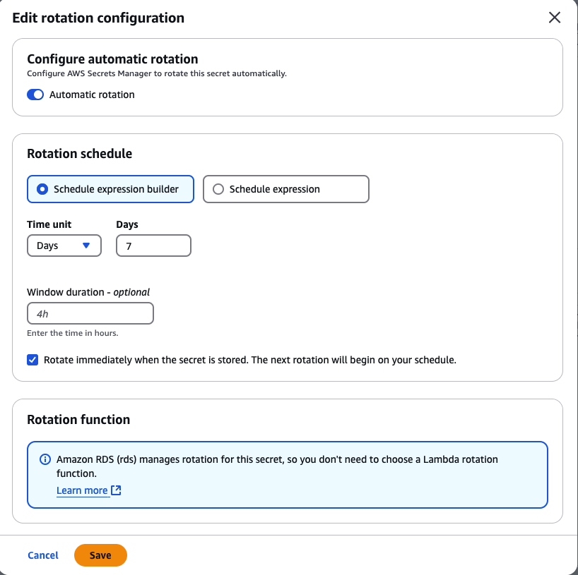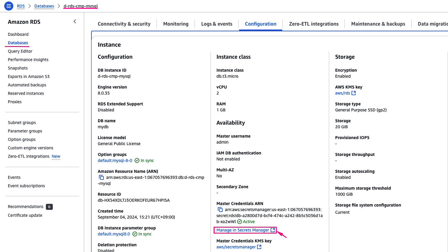 - Secret Manager lưu trữ thông tin username, password của DB, chúng ta có thể manual rotate hoặc setting sau bao lâu để rotate một lần. Thông tin ở Secret Manager được mã hoá sử dụng KMS