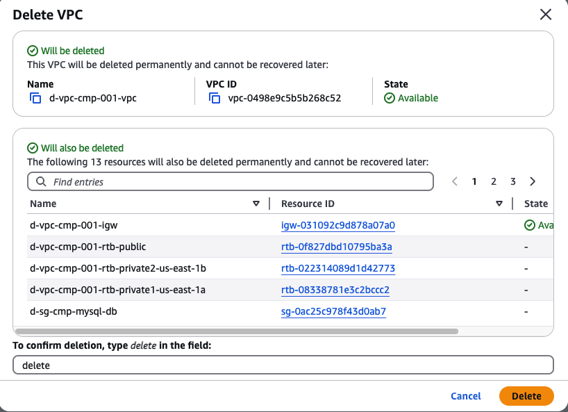 d-endpoint-cmp-secret-namager - Các thành phần phía trên Delete xong thì cuối cùng sẽ delete được VPC:
