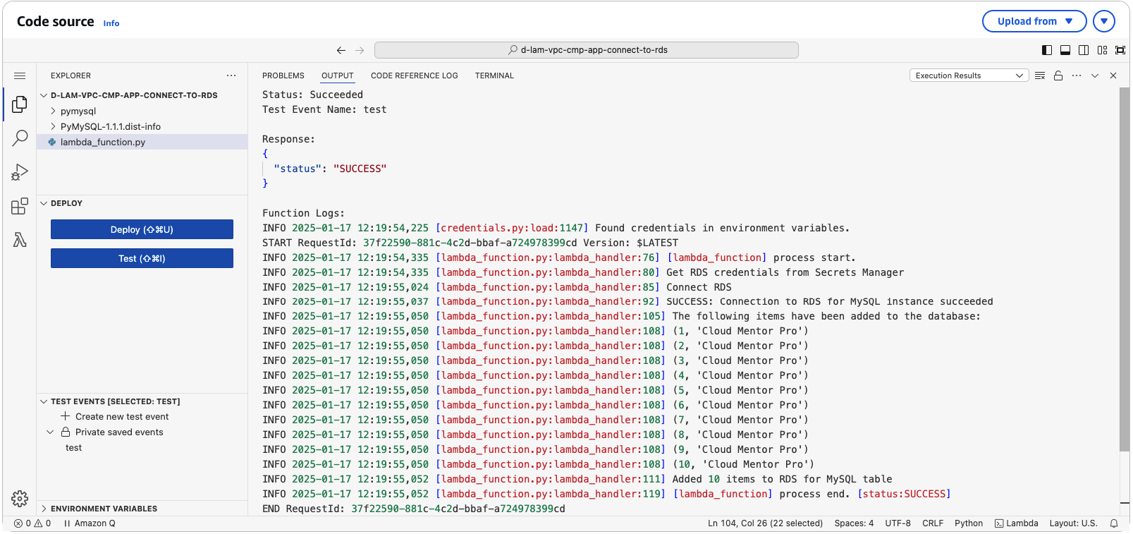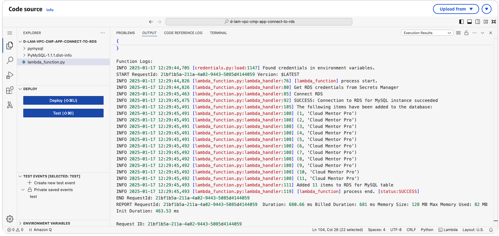 logger.info("SUCCESS: Connection to RDS for MySQL instance succeeded")