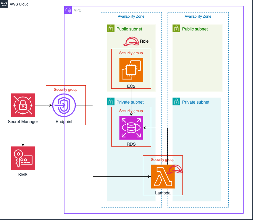 - Lambda setting nằm trong VPC trên 2 private subnet (đảm bảo HA), setting Security Group phù hợp, đồng thời để cho phép Lambda kết nối đến Secret Manager, chúng ta sẽ gắn Role tương ứng