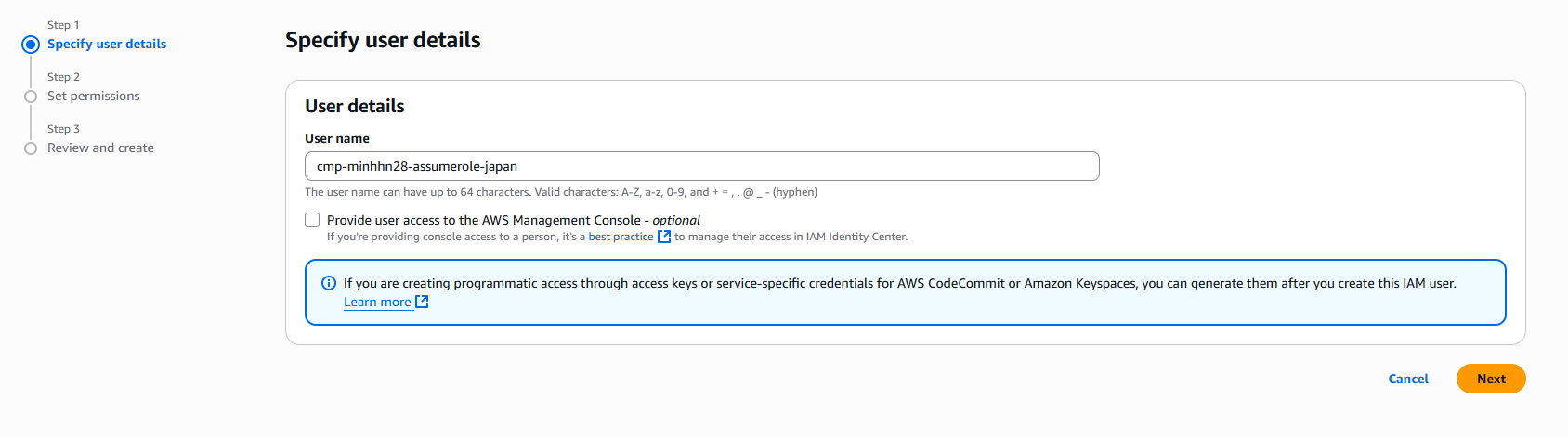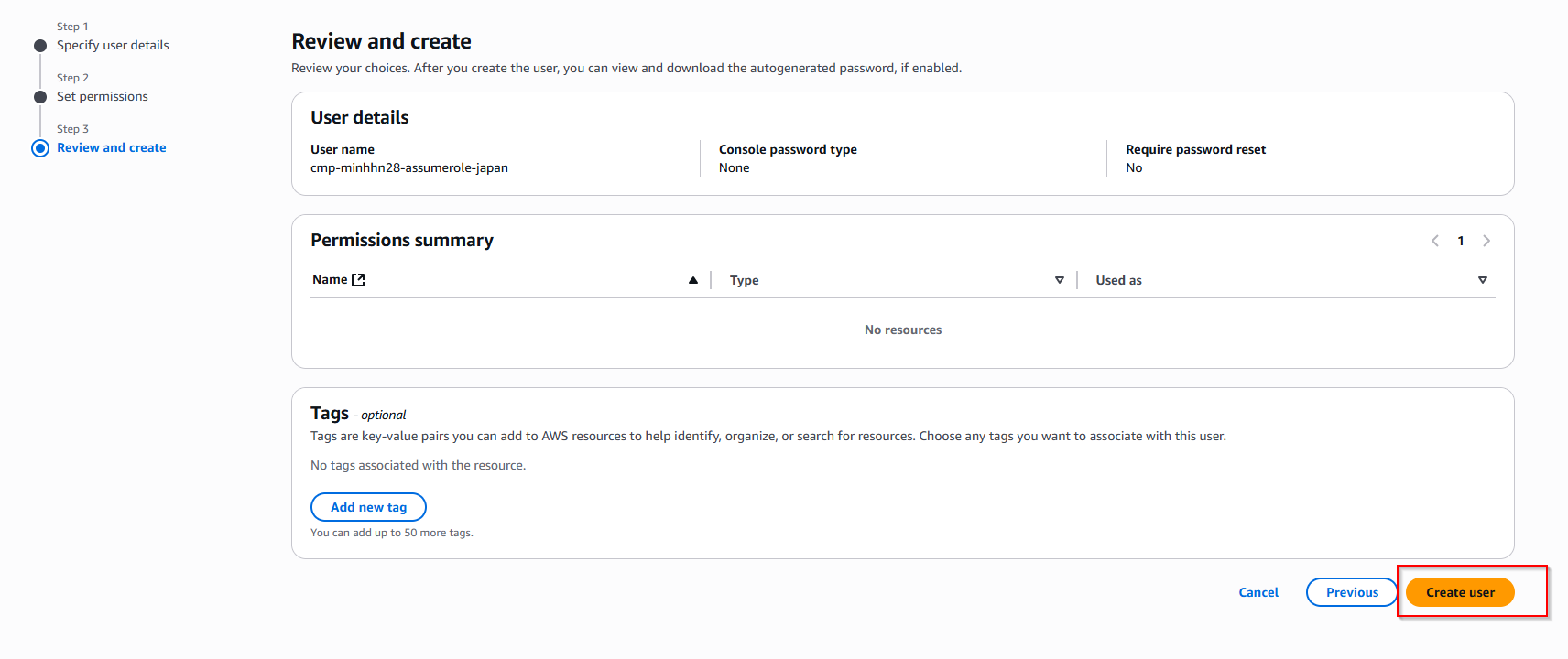 Tạo 1 user không có quyền nào. Truy cập dịch vụ IAM. Chọn User -> Create user -> Nhập tên role: cmp-minhhn28-assumerole-japan -> Nhấn Next -> Nhấn Next ->Review & nhấn nút Create user