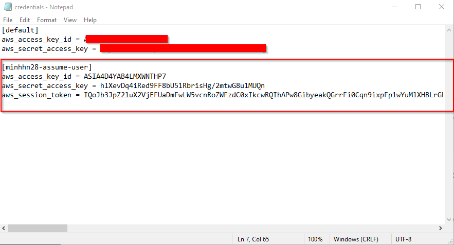 Mình sẽ thêm 1 profile là minhhn28-assume-user, cấu hình AWS_ACCESS_KEY_ID, AWS_SECRET_ACCESS_KEY, AWS_SESSION_TOKEN lấy ở trên