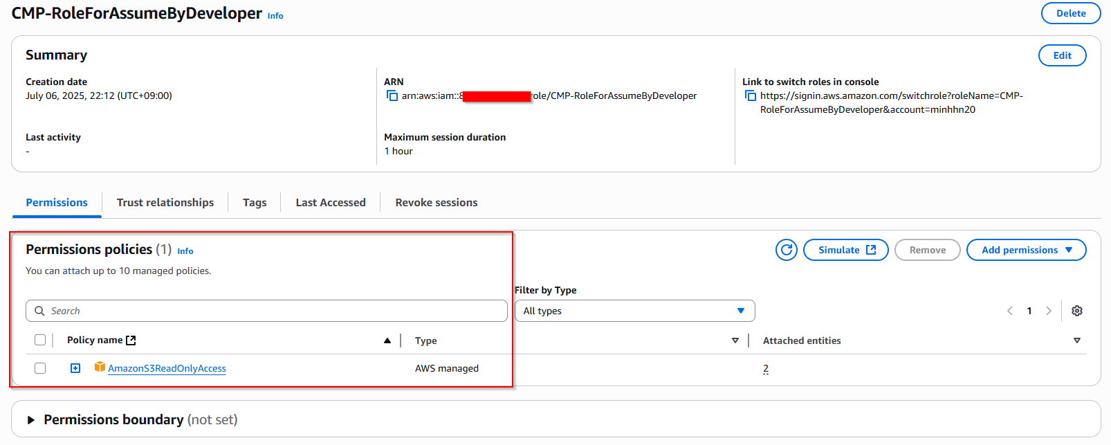 Theo ví dụ trong bài, Developer không có quyền gì khi mới được tạo. Tuy nhiên, sau khi thực hiện cấp Assume Role tài khoản Developer có thêm quyền chỉ đọc file trong S3.