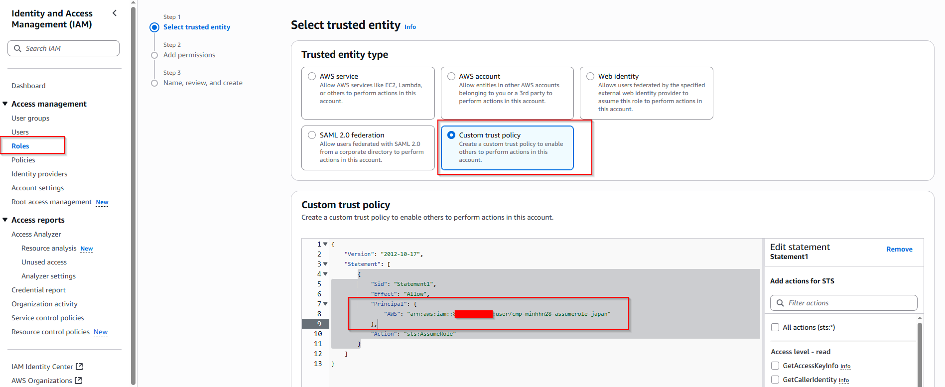 Ở mục Access management -> Chọn Role -> Create role -> Trusted entity type chọn mục: Custom trust policy