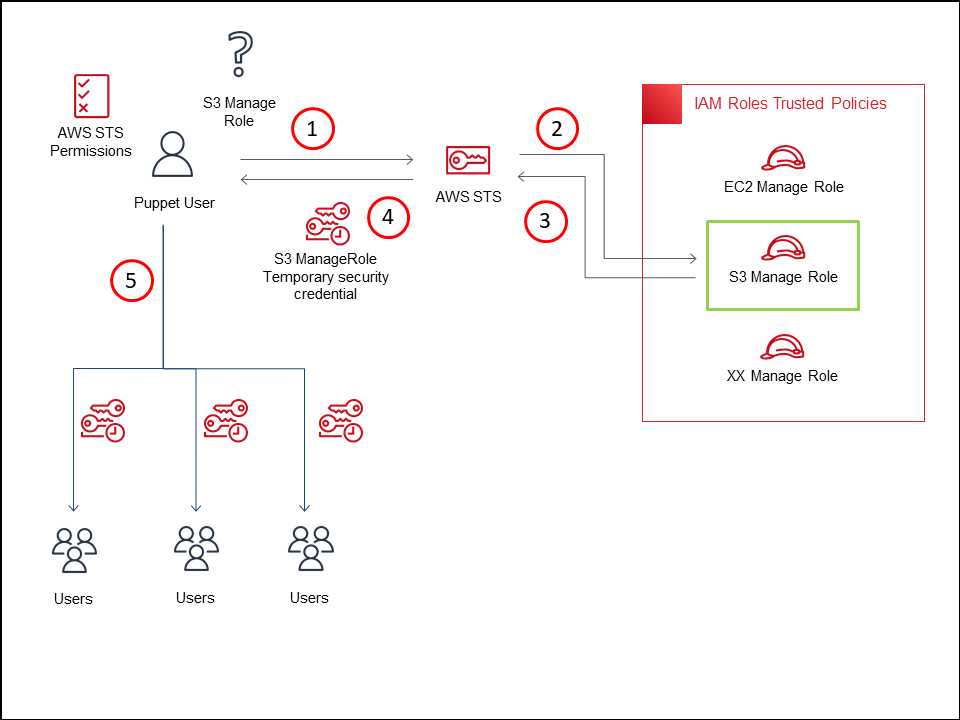 - Nếu có, AWS STS cấp "chìa khóa" có quyền truy cập S3 trong khoảng thời gian nhất định cho "Puppet User". Ngược lại, sẽ trả về lỗi Access Deny