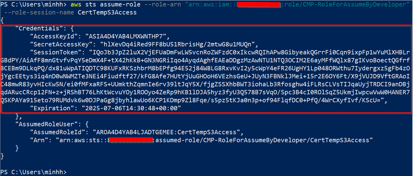 aws sts assume-role --role-arn "arn:aws:iam::<aws_acc_id>:role/CMP-RoleForAssumeByDeveloper" --role-session-name CertTempS3Access