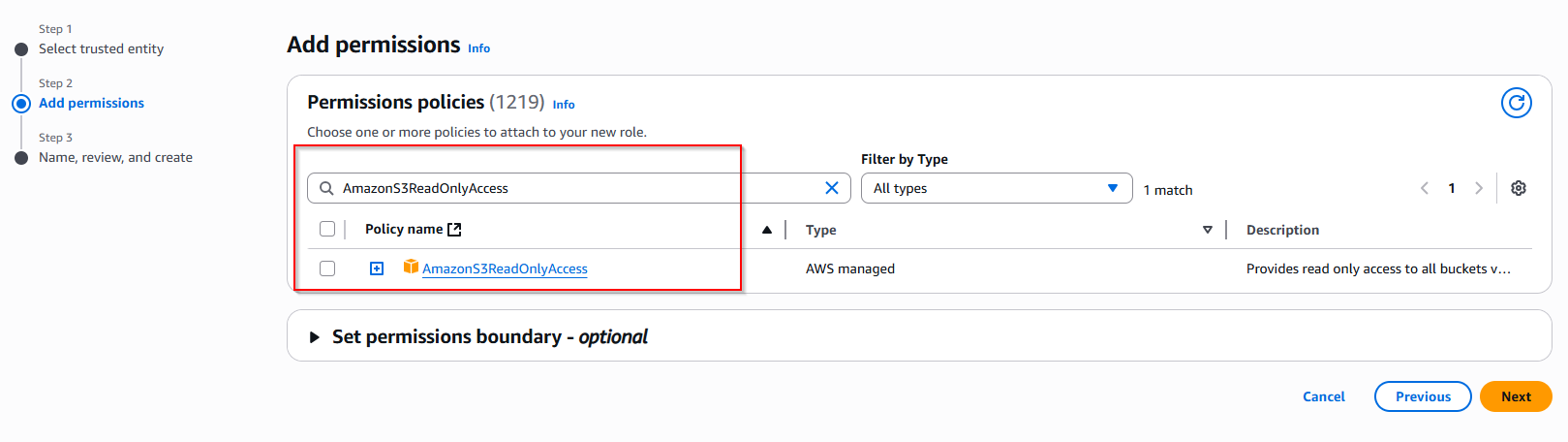 Tiếp theo, ở bước Add permissions: chọn Permissions policies là AmazonS3ReadOnlyAccess.