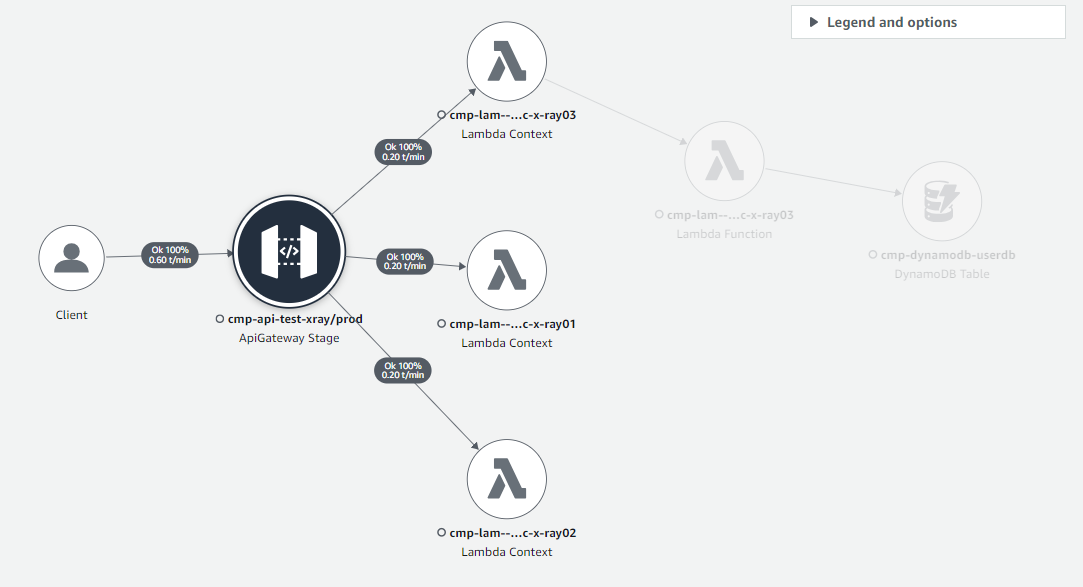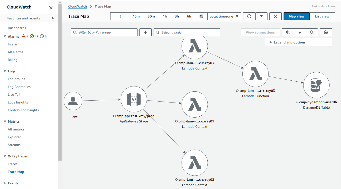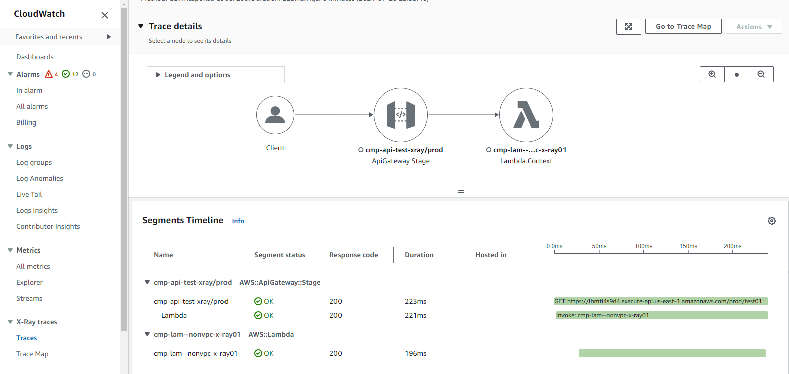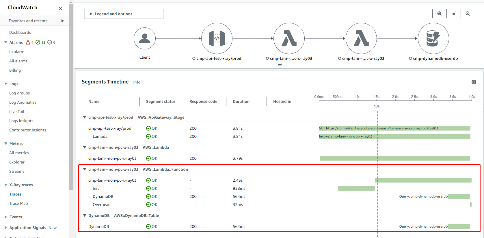 Tại màn hình Trace map, ta sẽ thấy các lệnh gọi API sẽ đi như thế nào. Mặc dù lambda cmp-lam-nonvpc-x-ray02 có xử lý liên quan đến get item từ DB nhưng không bật X-RAY nên thông tin liên quan đến DynamoDb không thể hiện, còn Lambda cmp-lam-nonvpc-x-ray03 có bật X-Ray nên đã hiển thị thông tin DynamoDB.