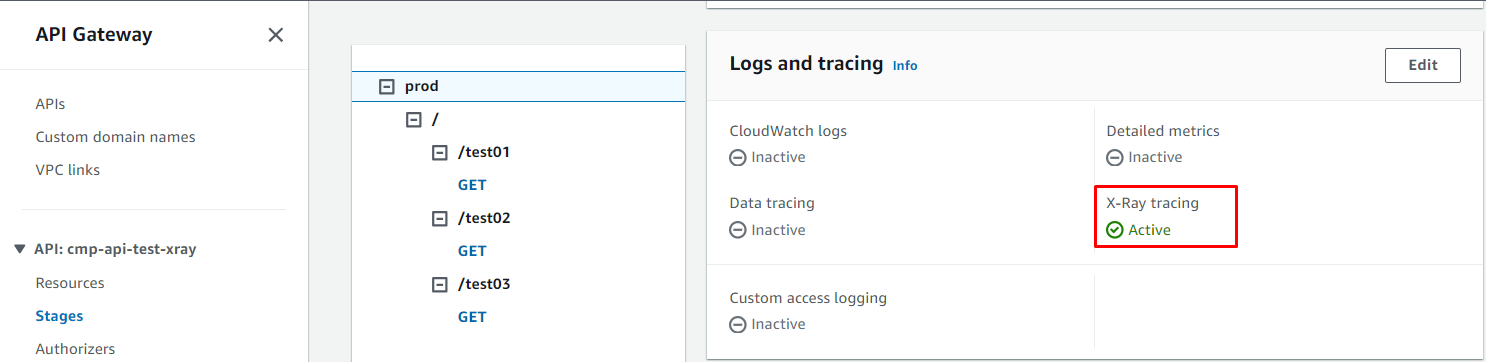 /test03GET, liên kết với lambda:cmp-lam-nonvpc-x-ray03. Tương tự như Pattern 2 nhưng khác ở chỗ có Enable X-Ray cho Lambda