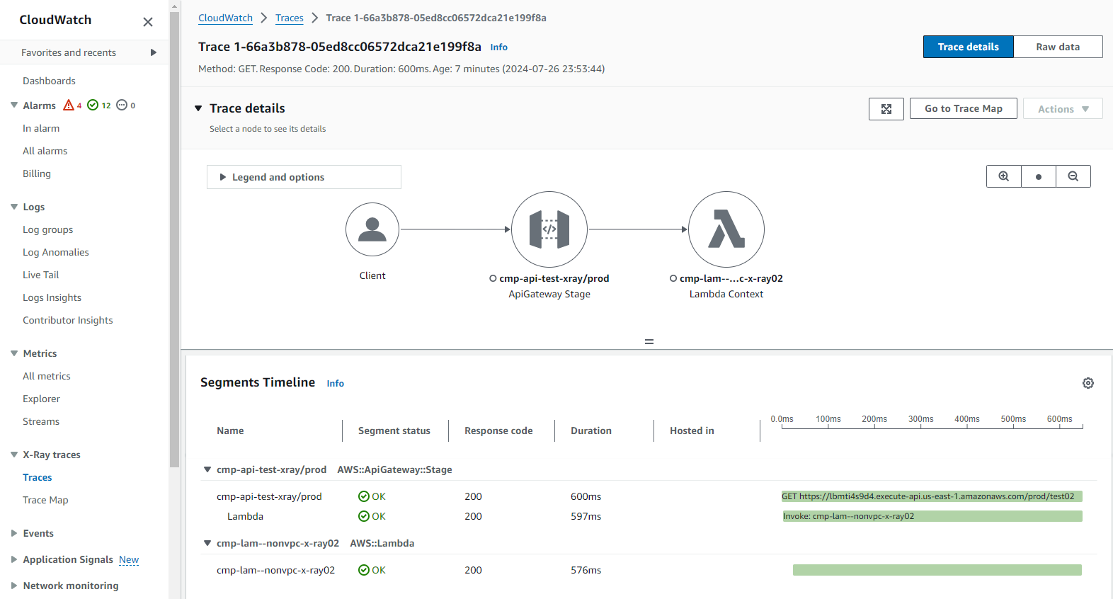 Xem flow request và response riêng lẻ một cách chi tiết. Mỗi segment hoặc subsegment hiển thị thông tin như phía request, phía được request, thời gian xử lý và status code.