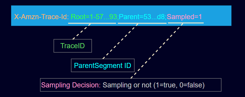 - Trace Header là HTTP Header định nghĩa: TraceID (Root), Parrent Segment ID, Sampling Decision (Sampled)