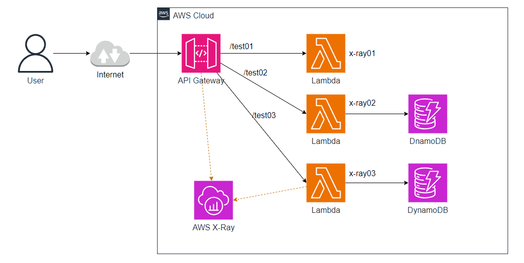 - API Gateway - Lambda(Có setting X-Ray) - DynamoDB