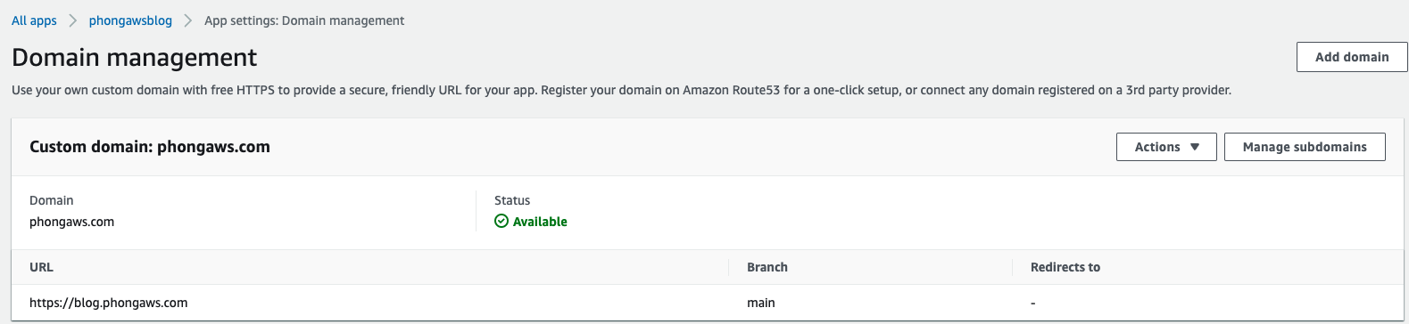 Sau khi build xong thì chúng ta có thể access đến một domain tạo sẵn có dạng https://develop...amplifyapp.com/ Để thay thế domain này mình sẽ vào mục Domain management ở Amplify, chọn Add domain -> chọn domain mình đã mua ở Route53 và tiến hành config