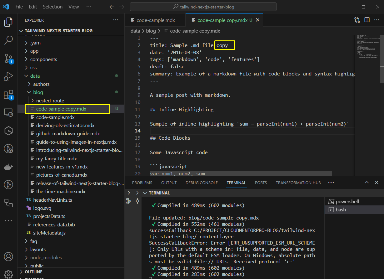 Copy bài code-sample.mdx và add thêm Copy vào title