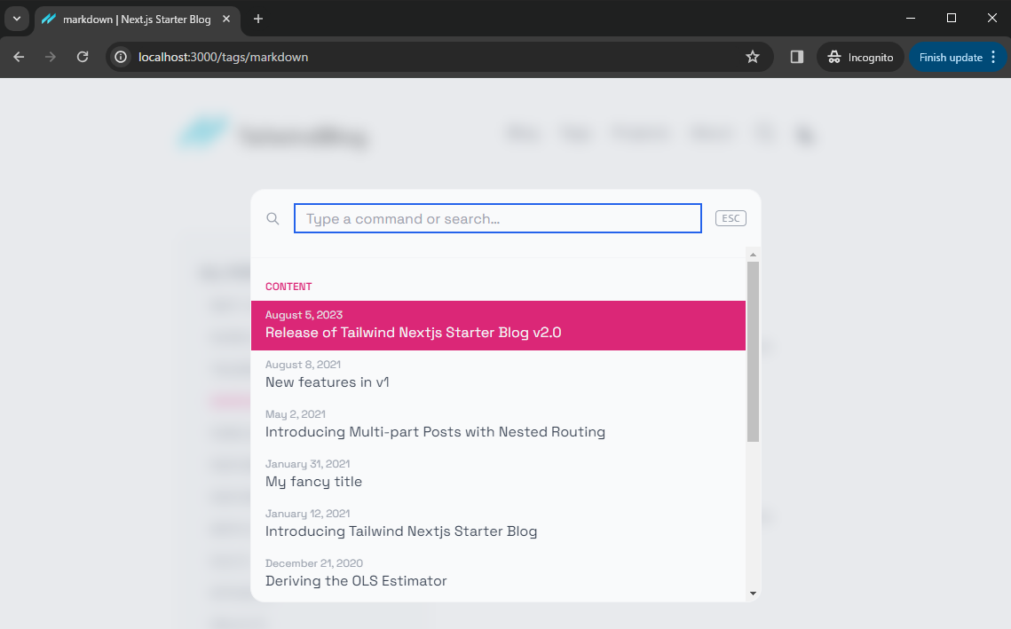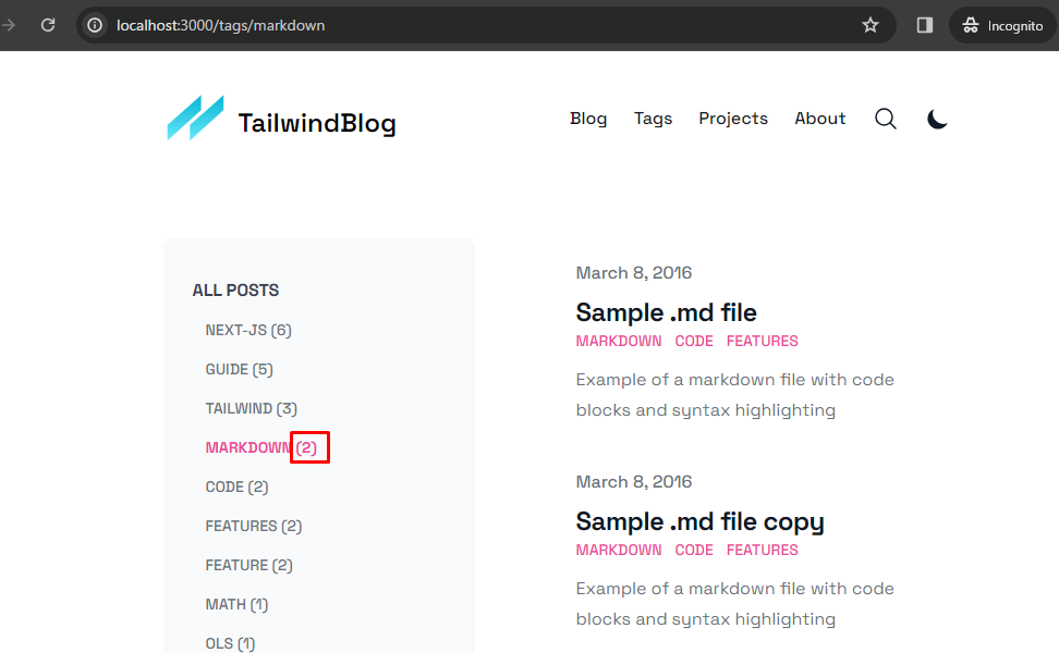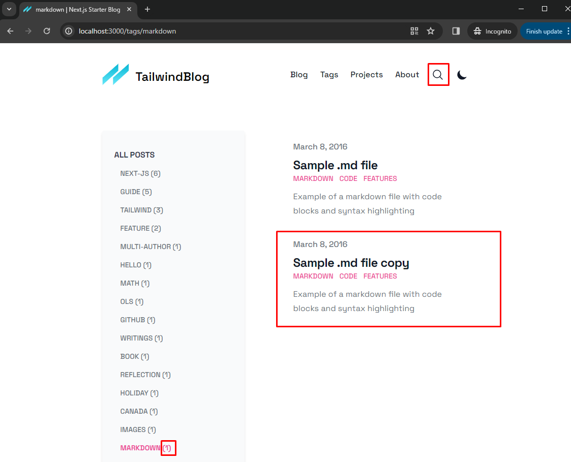 Bạn có thể tìm bài post mới thêm này tại menu markdown hoặc code hoặc features. http://localhost:3000/tags/markdown.