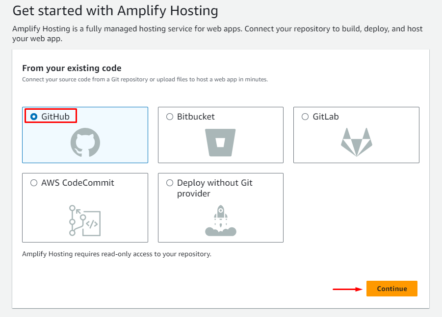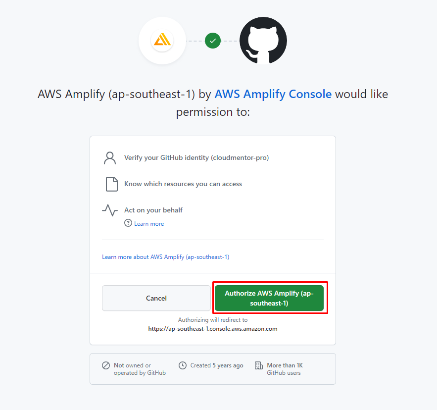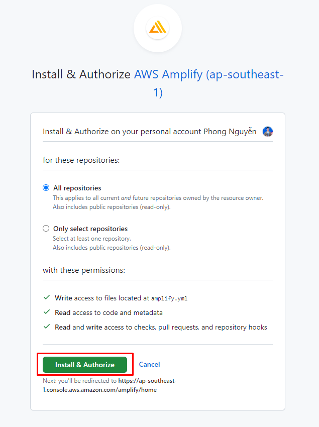 - Cho phép Amplify có quyền truy cập Github