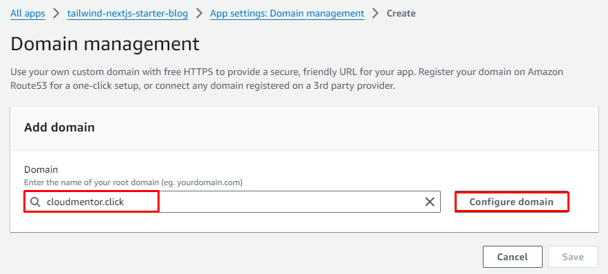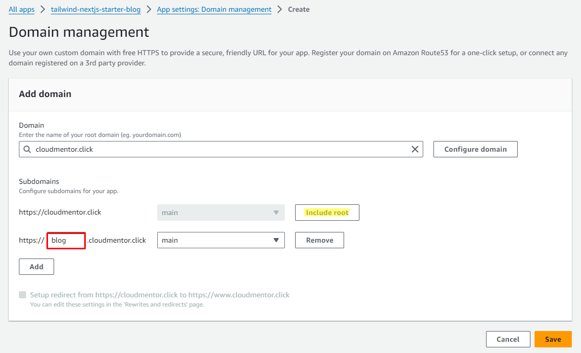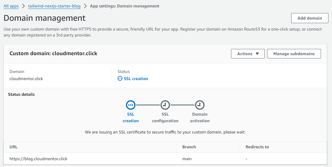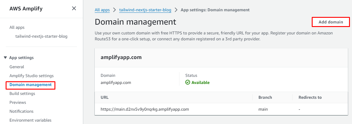 - Tại Amplify Console -> Domain management -> Click Add domain