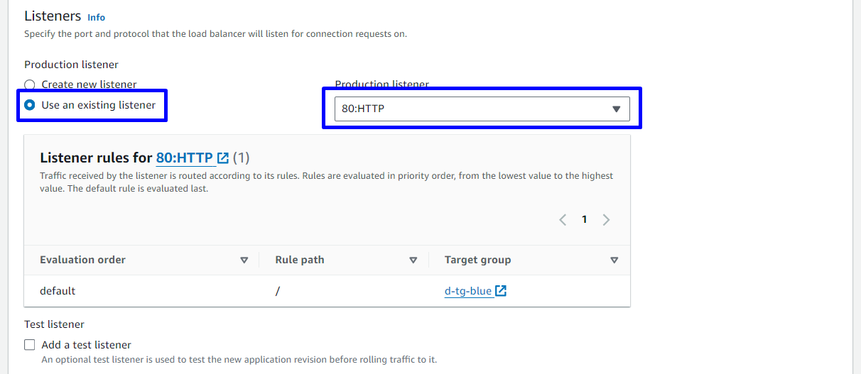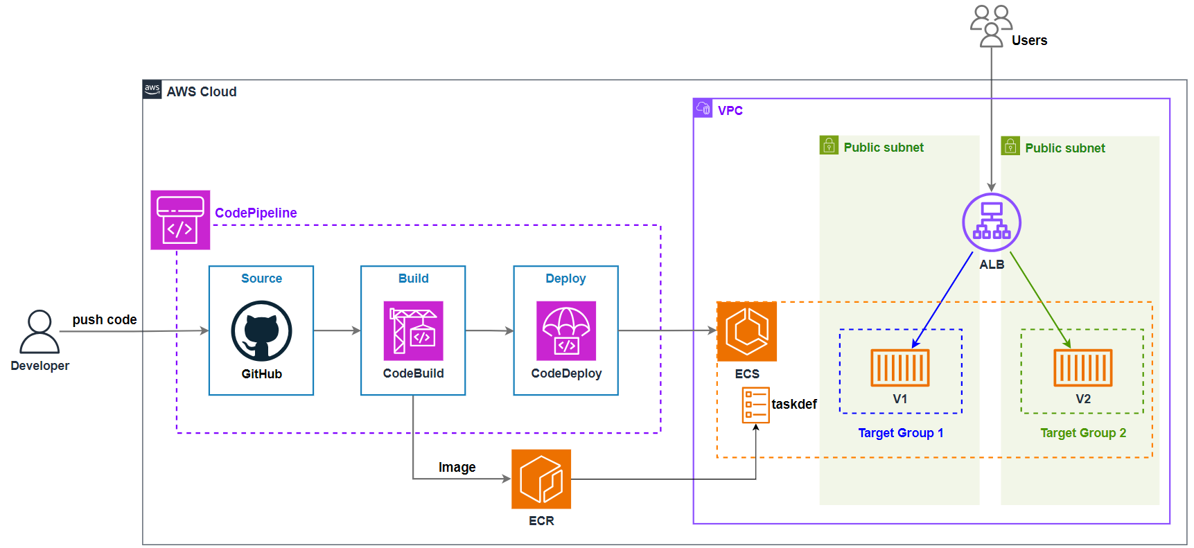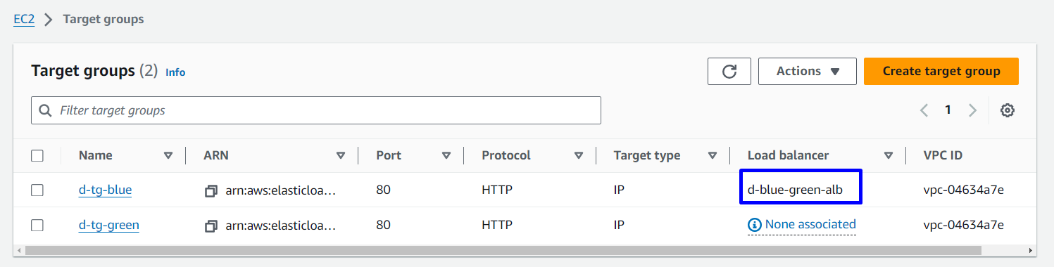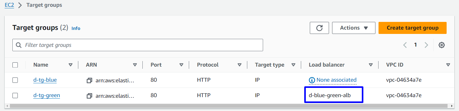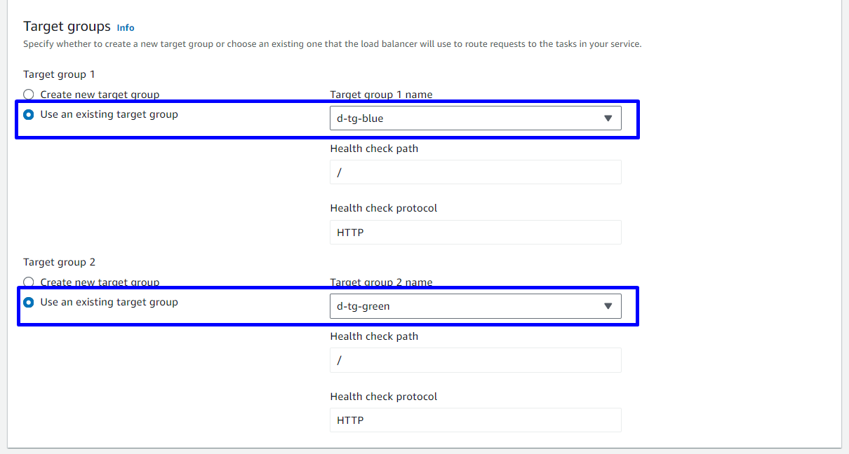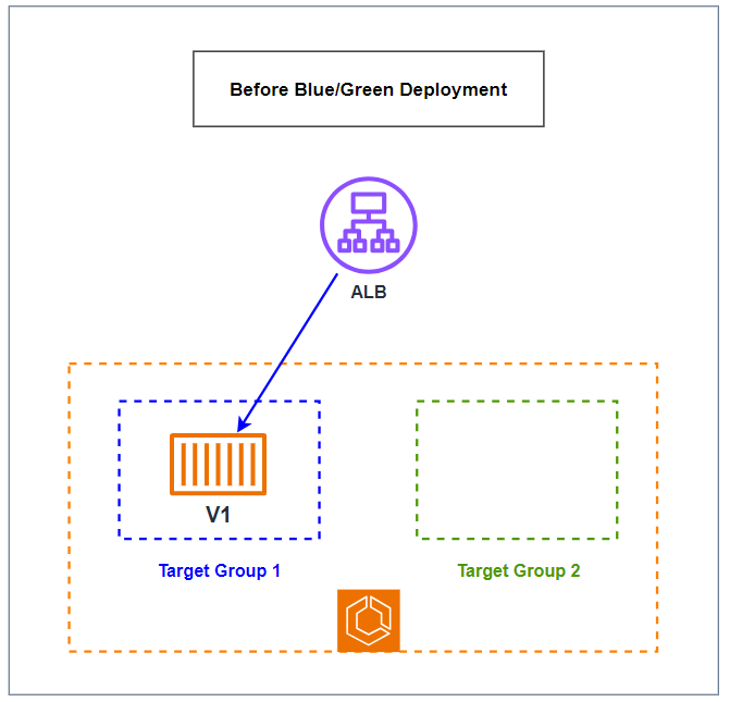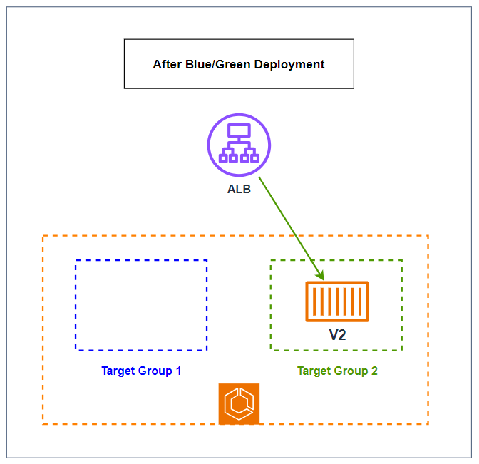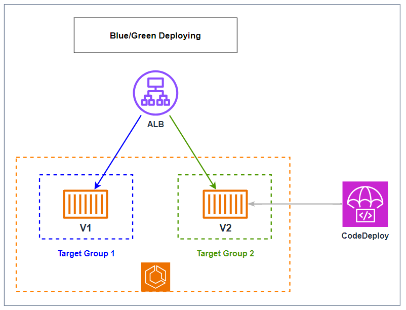 Hai Target Group được sử dụng để định nghĩa hai nhóm tasks khác nhau. Một Target Group sẽ đại diện cho môi trường hiện tại (Blue) và cái còn lại đại diện cho môi trường mới (Green). Khi quá trình triển khai diễn ra, CodeDeploy sẽ gán các tasks mới (Green) vào Target Group 2 (Green), đồng thời giám sát healthcheck của chúng. Khi tất cả các tasks trong Target Group 2 (Green) hoạt động ổn định, CodeDeploy sẽ chuyển toàn bộ traffic từ Target Group 1 (Blue) sang Target Group 2 (Green) thông qua Load Balancer.