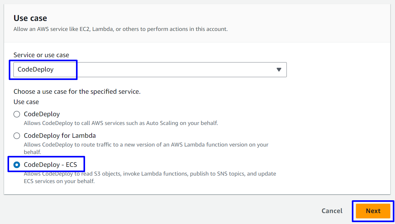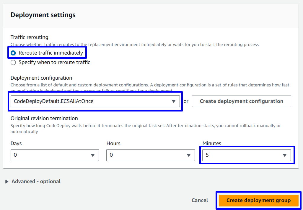 - CodeDeployDefault.ECSAllAtOnce: Chuyển toàn bộ traffic truy cập sang Amazon ECS container đã được cập nhật một lần duy nhất.
