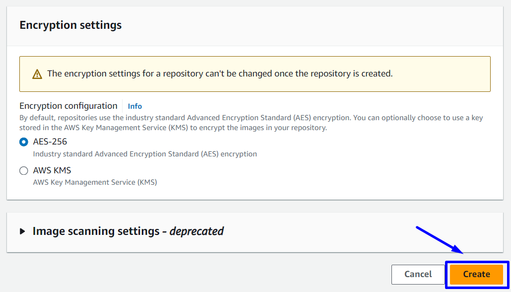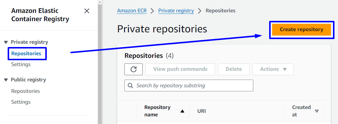 Tại Amazon Elastic Container Registry Console -> Repositories -> Create repository