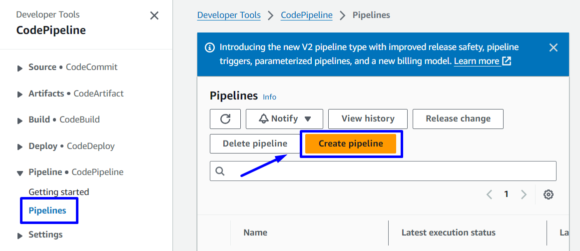 Tại Console CodePipeline -> Pipelines -> Create pipeline