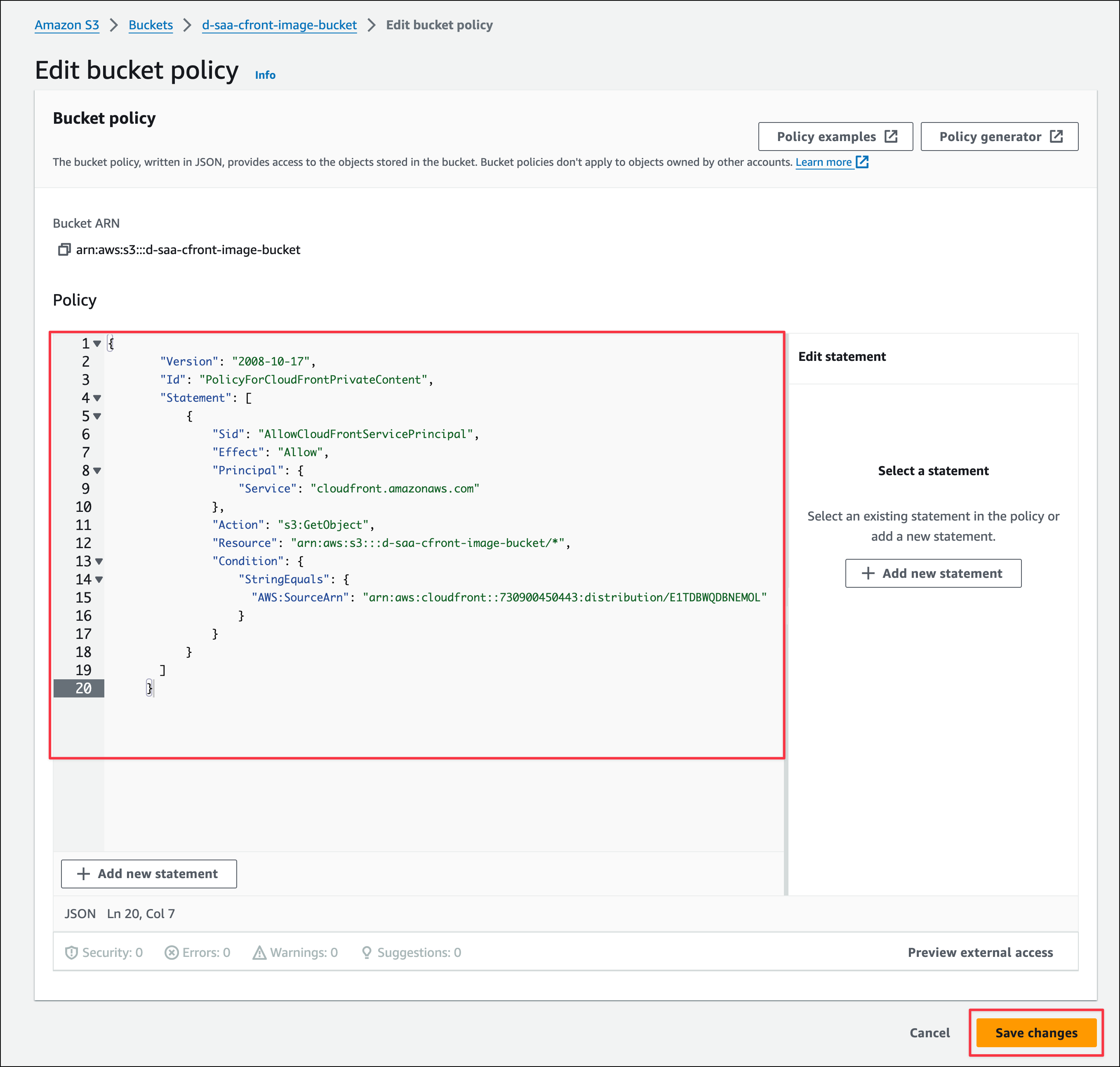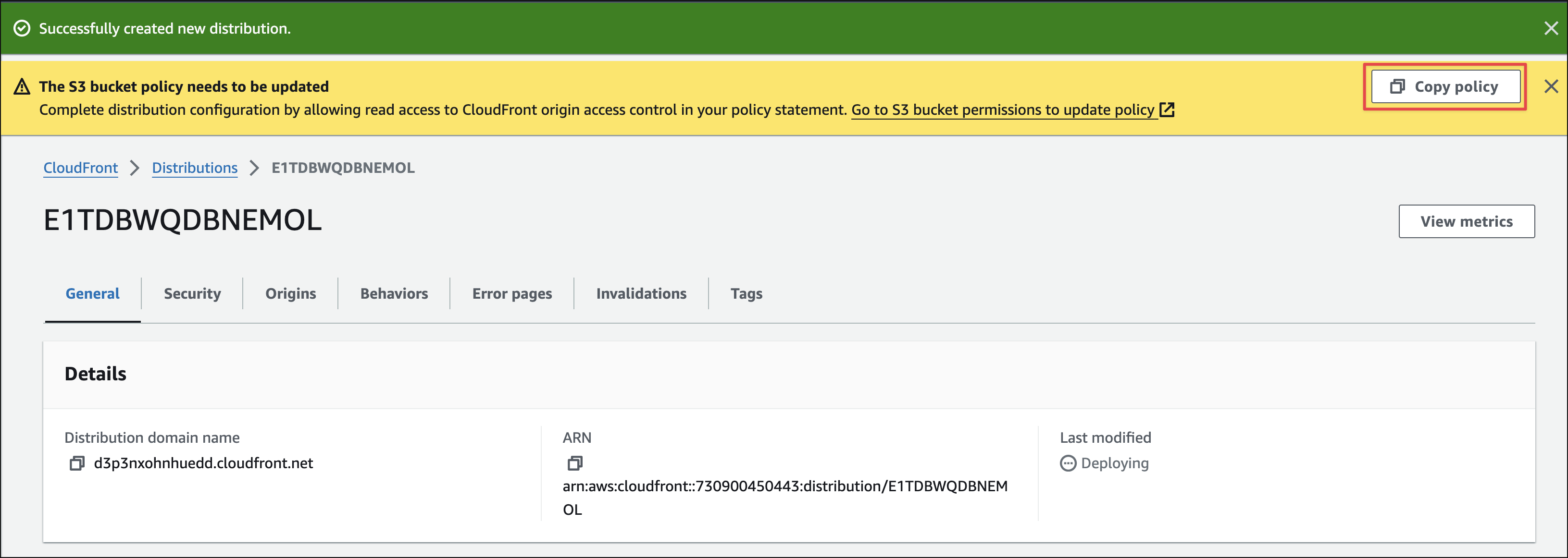 Sau khi tạo xong distribution thì sẽ cần setting s3 bucket policy để cho phép Cloudfront có quyền truy cập