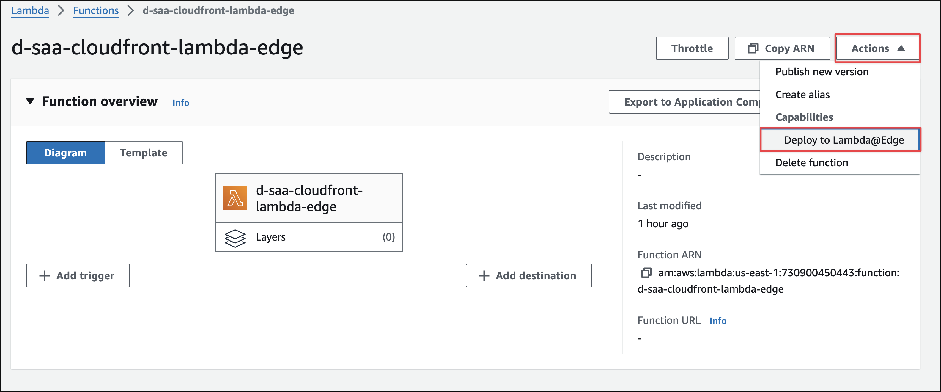 Sau khi deploy xong, nhấn Actions > Deploy to Lambda@Edge để thực hiện deploy lambda ra edge location