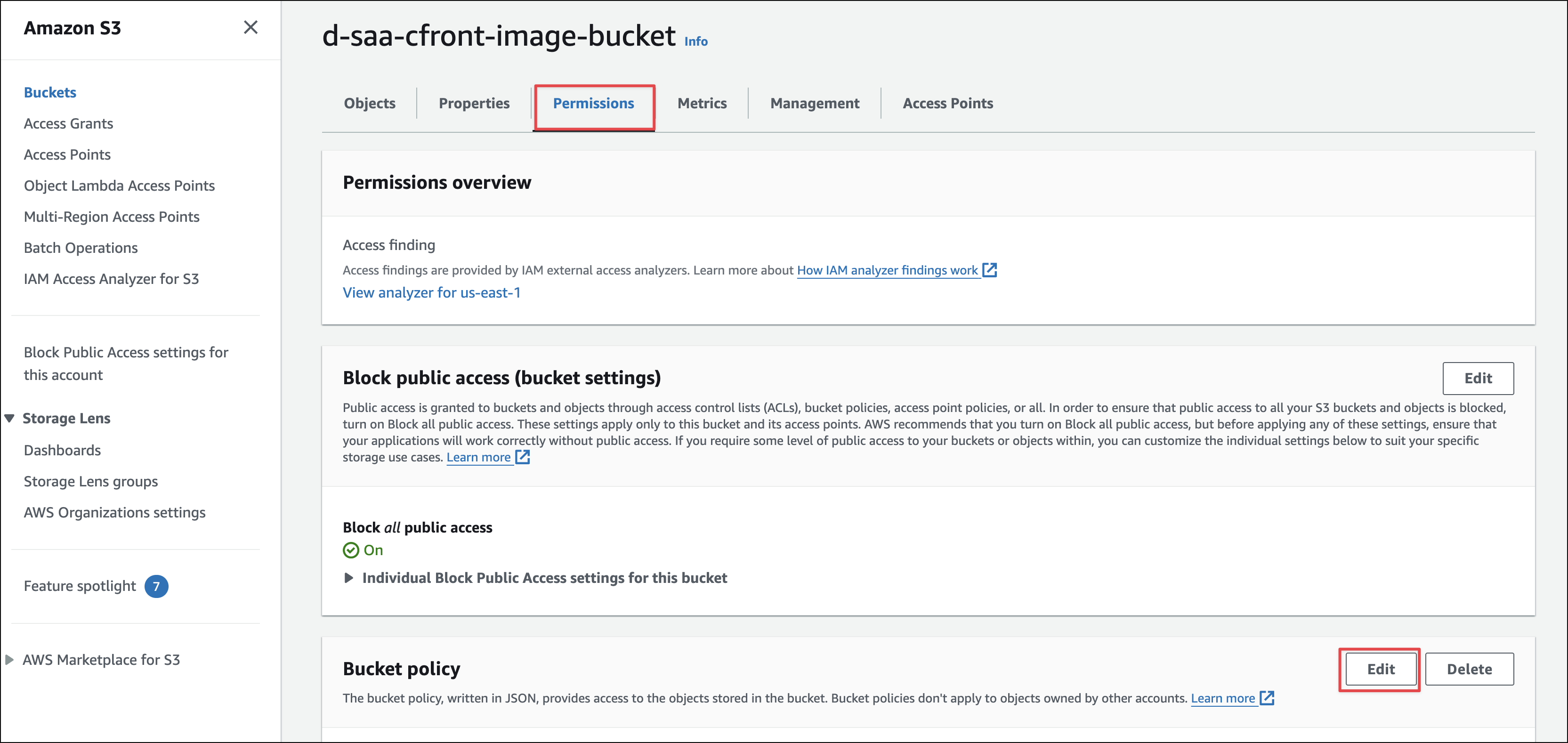 Mở lại s3 bucket đã tạo ở step 1, chọn Permissions > Bucket policy > Edit