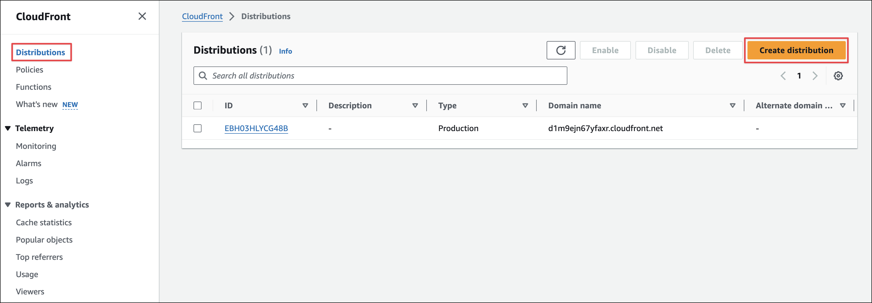 Vẫn thao tác từ Cloudfront console, chọn Distributions > Create distribution
