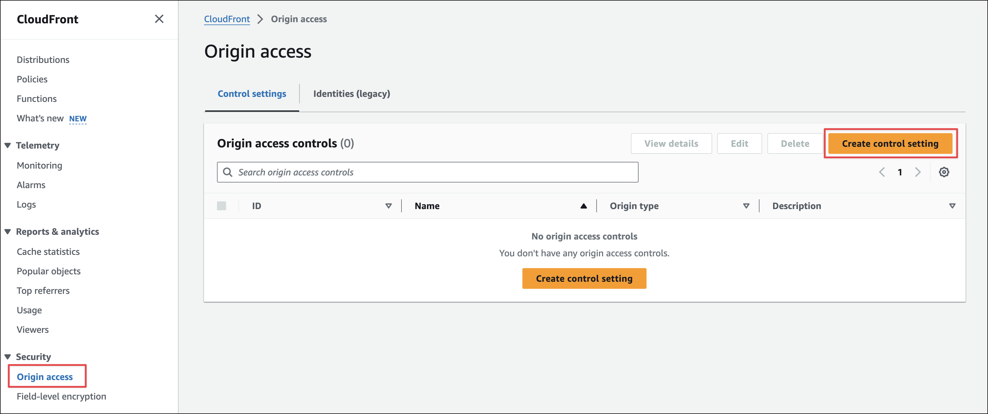 Vào Cloudfront console, từ menu bên trái chọn Origin access, nhấn Create control setting