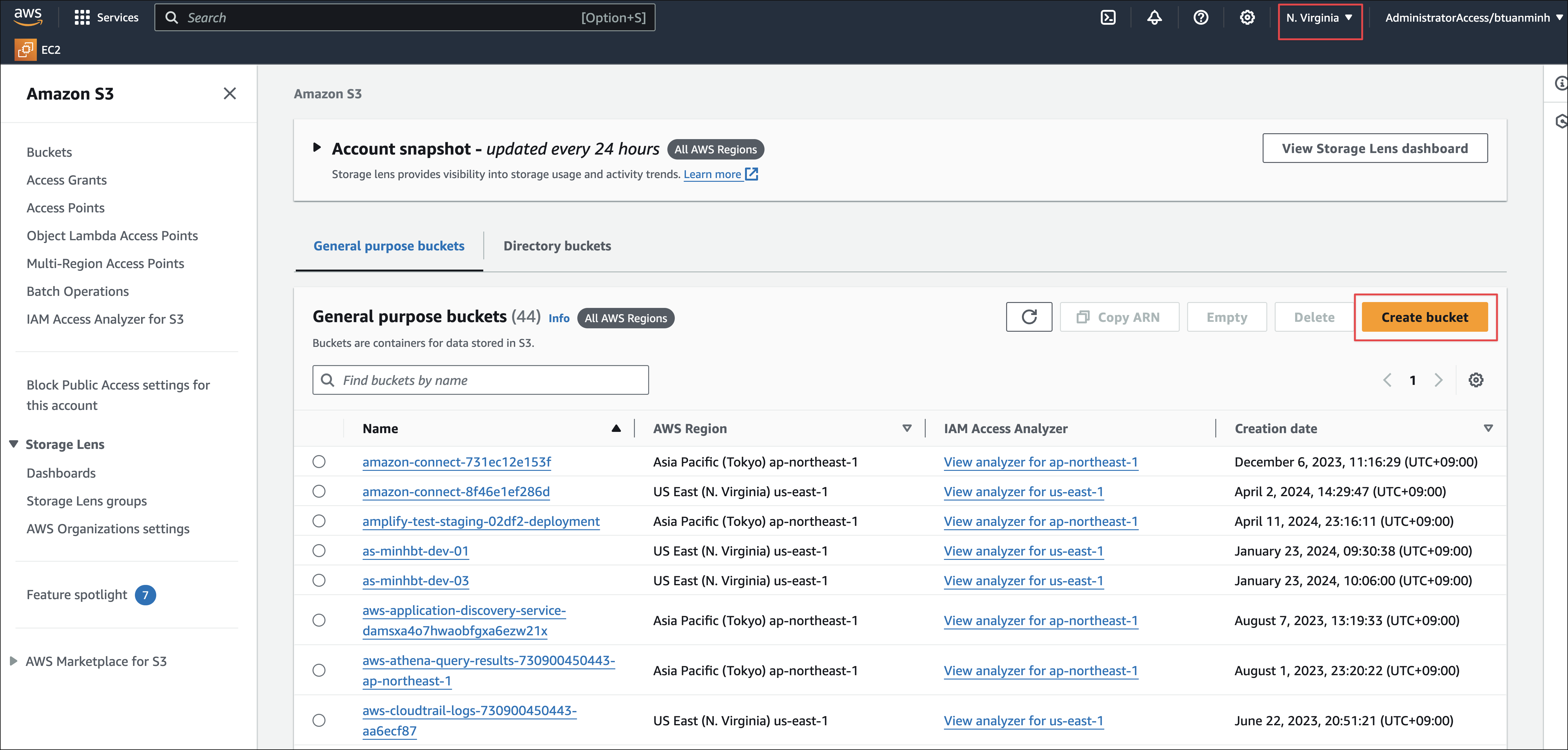 Vào S3 console, chọn region N.Virginia (us-east-1), rồi nhấn Create Bucket
