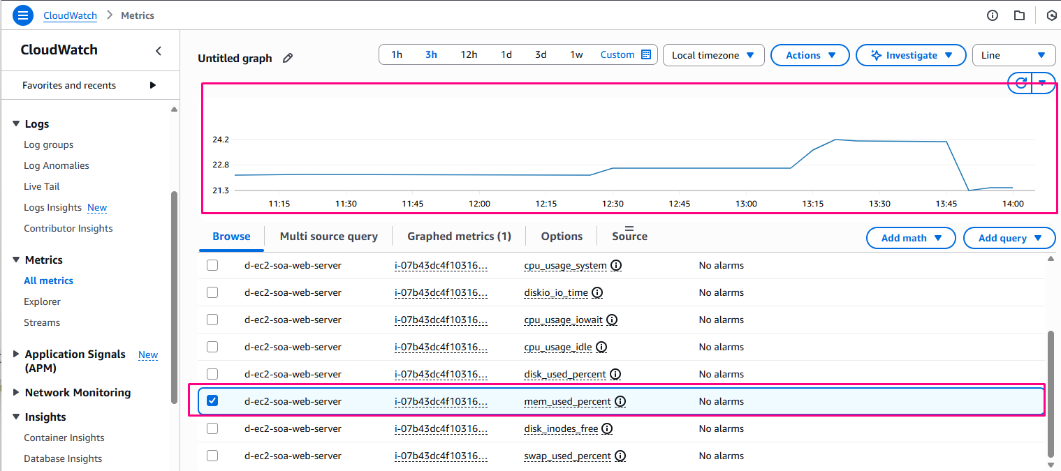 Đợi vài 5-10 (vì CloudWatch hiển thị metric chậm) phút chúng ta có thể thấy Metric được gửi đến CloudWatch từ EC2 d-ec2-soa-web-server-02