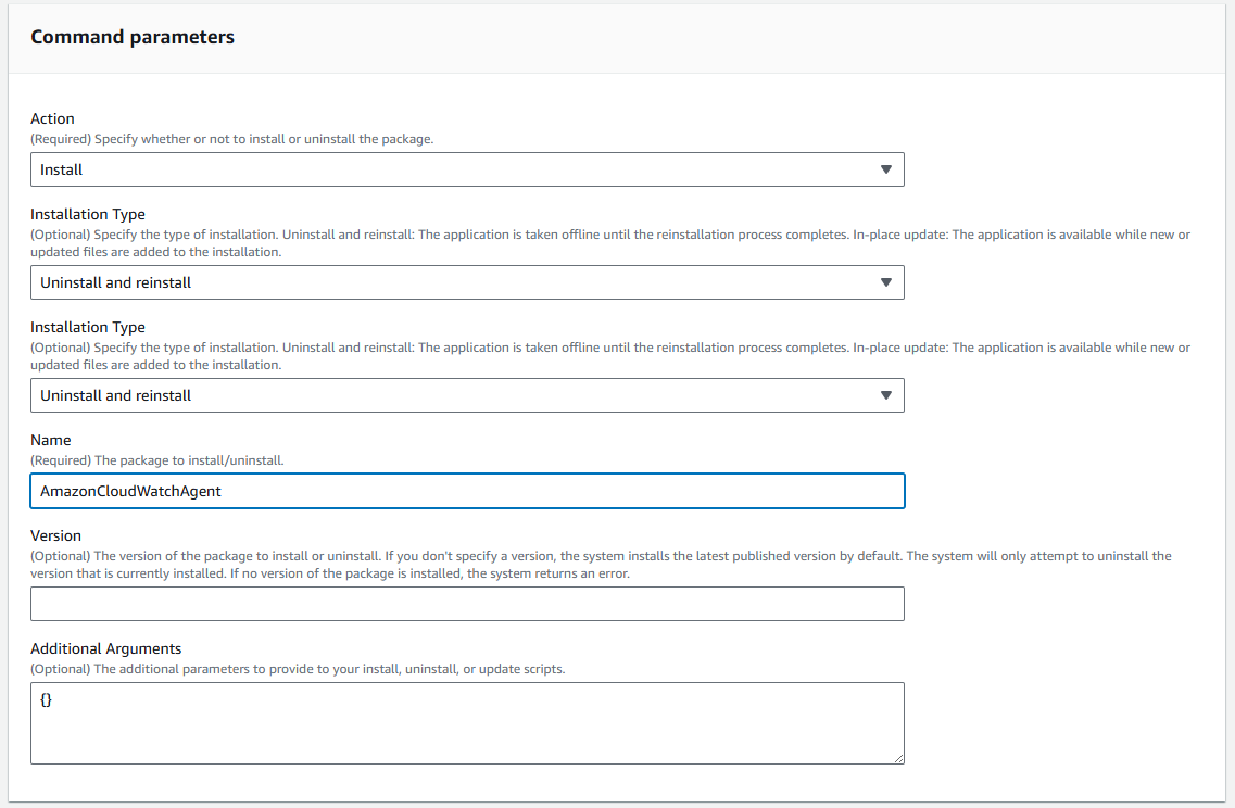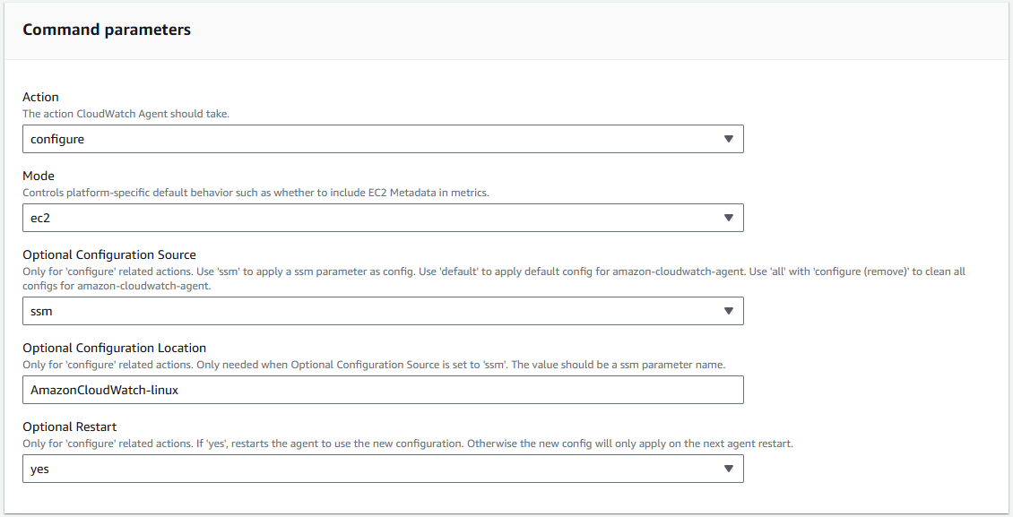 sudo /opt/aws/amazon-cloudwatch-agent/bin/amazon-cloudwatch-agent-ctl -a fetch-config -m ec2 -s -c ssm:AmazonCloudWatch-linux
