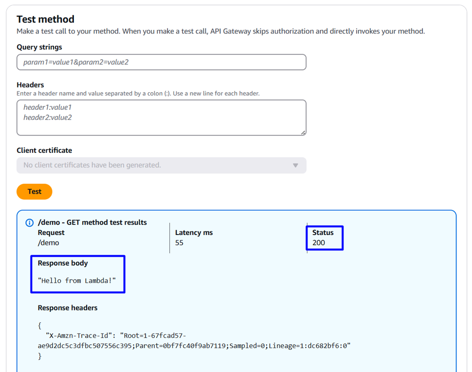 Kết quả test thành công: Status 200 và Response body trả về "Hello from Lambda!"