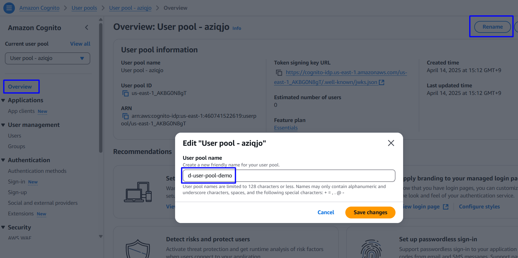 - Sau khi tạo user pool xong, vào user pool vừa tạo -> Menu Overview -> Click Rename