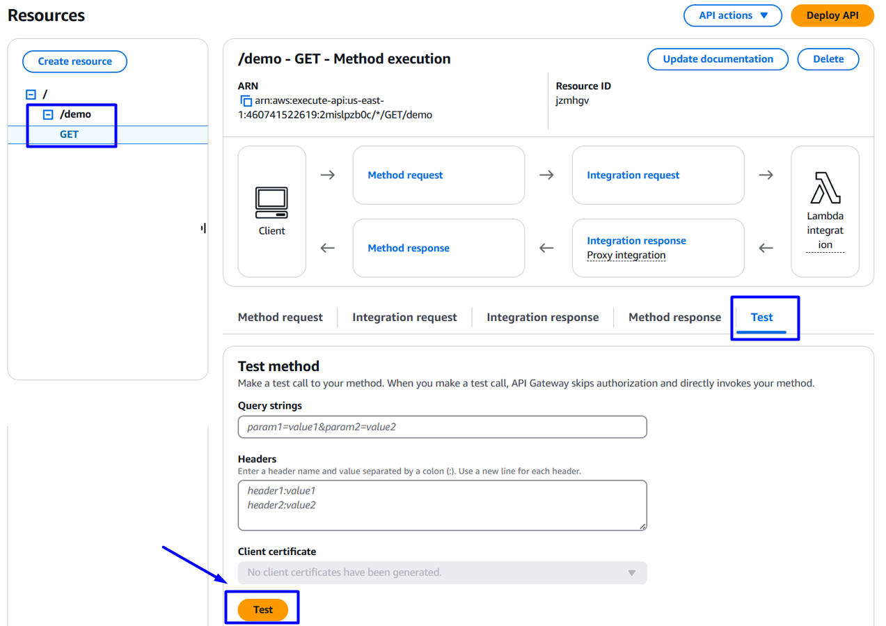 Tại Resources /demo-> Method GET-> Chọn tab Test -> Click Test